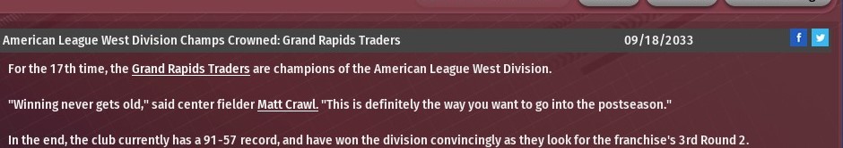 The Grand Rapids Traders became the first team to clinch a postseason berth in the 2033 season, as a 12-1 rout of Dayton clinched them the American League West championship.