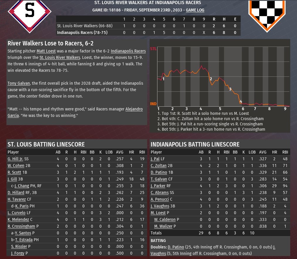 St. Louis starting pitcher Alex Pazos didn't allow a hit over the first three innings, a little over an inning later he was done having allowing six runs in a span of 11 Indianapolis batters as the Racers went on for a 6-5 win at the Astrodome (1995). Back-to-back homers from Rick Scott, a two-run shot, and Hector Taveras in the top of the third had staked Pazos to a 3-0 lead. That disappeared in the bottom of the fourth. Pazos actually retired two of the inning's first three batters, getting a pair of ground outs around a one-out double by CJ Abrams. Then things came unraveled. Tony Galvan singled to score Abrams. Jake Parker followed with a double, scoring Galvan to make it 3-2. Kyle Soloman then put the Racers in front with a two-run home run. An inning later, Pal led off with a single off Pazos. Abrams then sent him to the shower with a two-run homer. The River Walkers did pull within 6-5 in the top of the ninth on a two-run, two-out pinch-hit homer from Javon Gill off Indy closer Eric Watkins. But that would be the end of the scoring. Autin (12-8) allowed three runs on seven hits in six innings. He struck out 11 and didn't walk a batter. Drew Dillard pitched two innings of scoreless relief. Watkins gave up the Gill homer, but still earned his 14th save. |