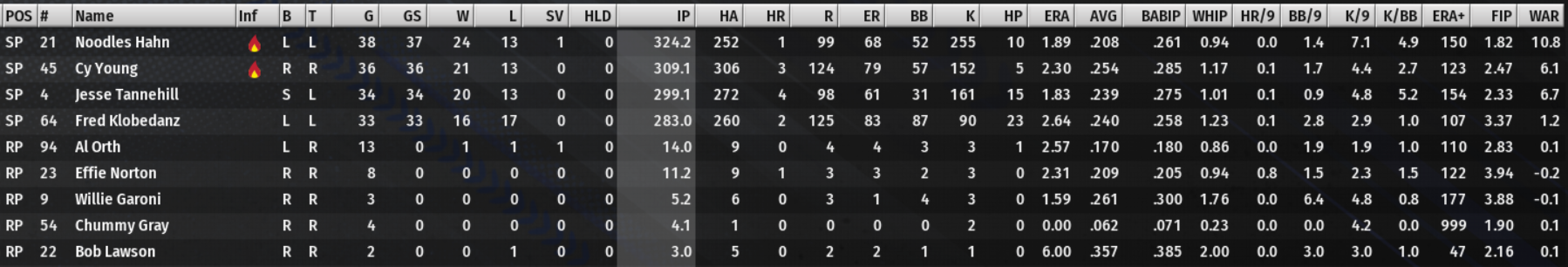 Player pitching stats for the 1901 season, with the first image sorted by IP and second image sorted by WPA. While it is unlikely that Noodles Hahn (10.8 WAR and 5.0 WPA) will be able to surpass Rube Waddell in the race for the Platinum Pitcher award, Hahn had a great season and is clearly a Top-3 pitcher in the MLB. Unsure if Cy Young will be able to match his 1901 season performance next year, but the trade benefit was worth it. Lastly, will likely try to move Fred Klobedanz to get a little more out of the 4th spot.