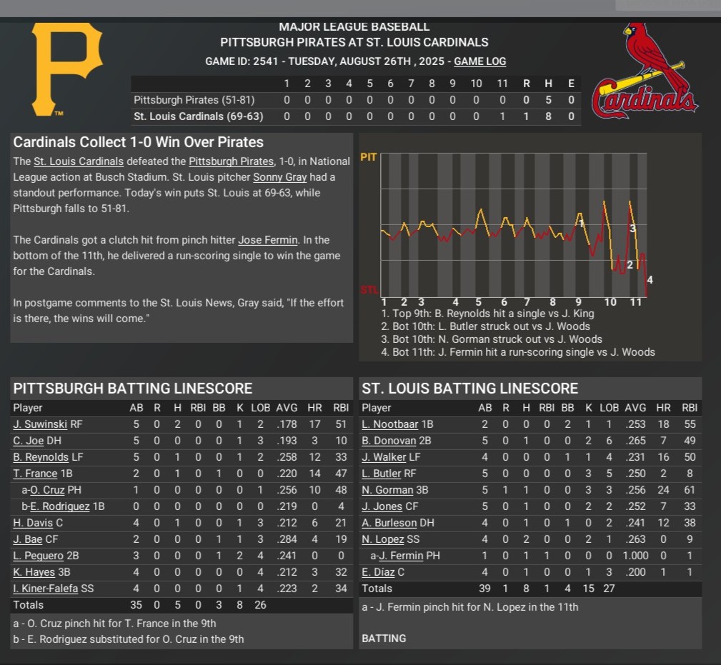 Cards news: August 26 -- St. Louis Cardinals 1, Pittsburgh Pirates 0, 11 innings