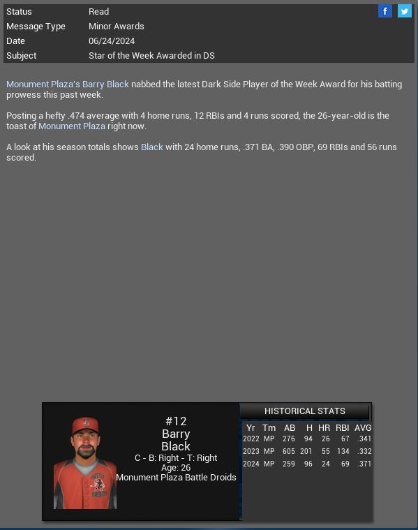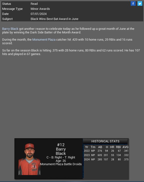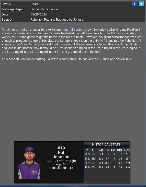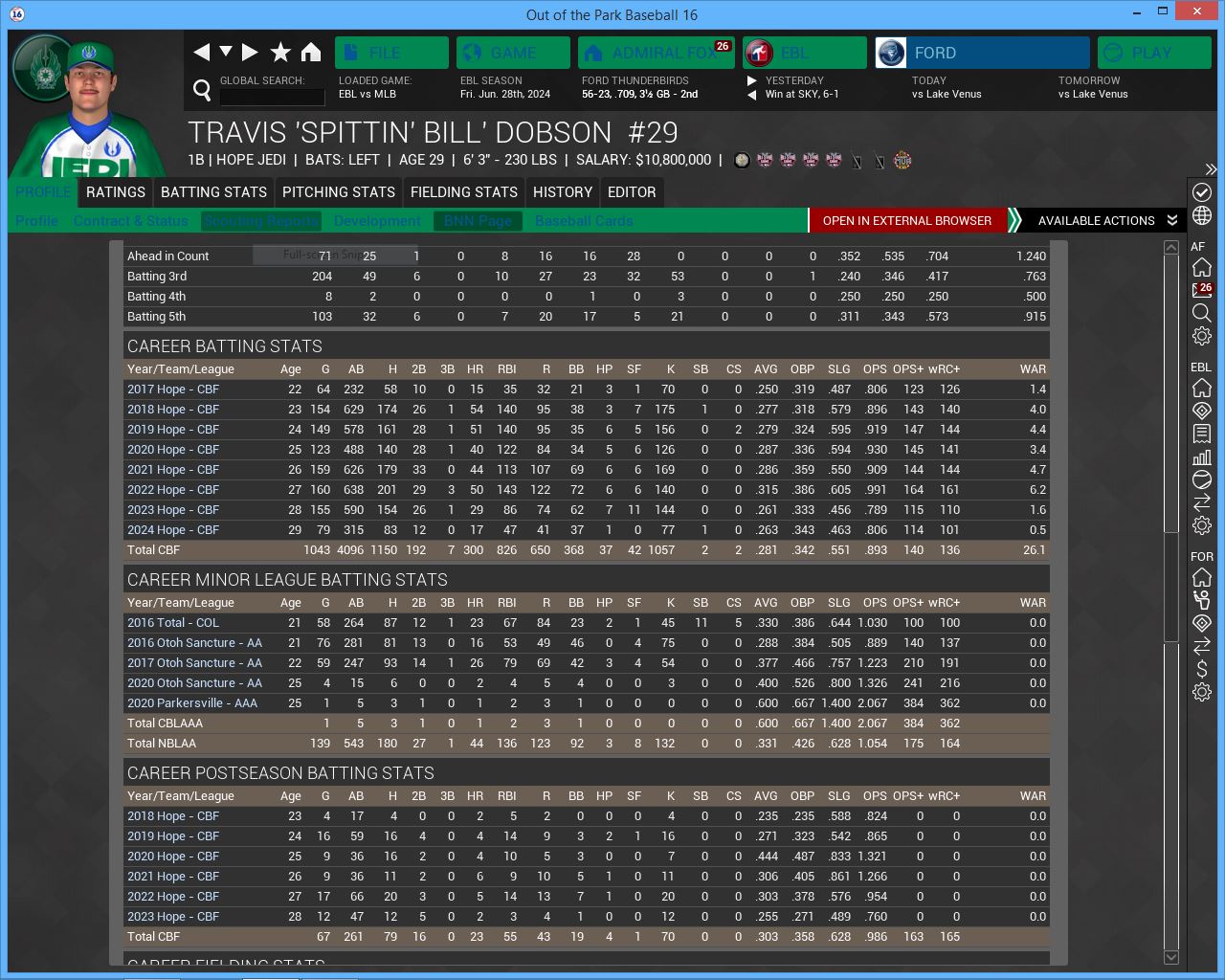 Jedi 1b Travis Dobson career stats. Veren loses Rf Jayden Hodgkins for 4 weeks. Freedom City Millennium Falcons traded C Ed Fraser to the Bird City Falcons for RP Bill Duncan & a minor league P. Sharks 2b J.J. Wellington smacks 5 hits vs Delgado. Sharks Rf Gin-fan Sung hits 3 HR vs Delgado.