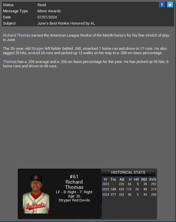Madison CF Earl Morris named NL BOTM. Endor City SP John Hammer is named AL POTM. Tim Waters is named NL POTM. Red Devils LF Richard Thomas is named AL ROTM.