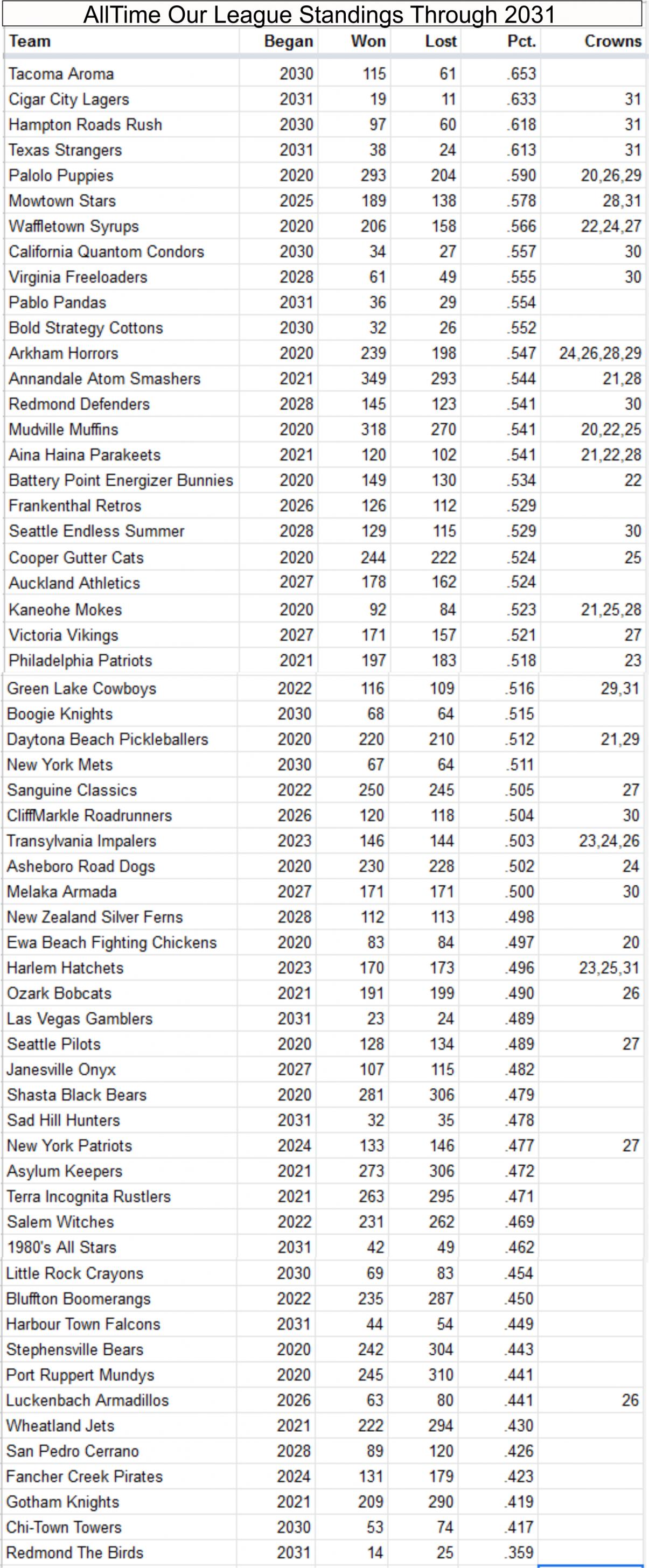 The Seattle Rainiers did not make it into the Bronze league. ![]() Gabeeg is in a separate Silver league for the third week in a row. I think it's time to give up on Fancher Creek. Perfect 404 Aina Haina Parakeets Battery Point Energizer Bunnies Bold Strategy Cottons California Quantom Condors Cigar City Lagers Ewa Beach Fighting Chickens Kaneohe Mokes Luckenbach Armadillos Virginia Freeloaders Diamond 351 Crichton Leprechauns Green Lake Cowboys Palolo Puppies Transylvania Impalers Seattle Pilots Southern Southpaws Waffletown Syrups Gold 328 Annandale Atom Smashers Cooper Gutter Cats Harlem Hatchets Motown Stars Seattle Endless Summer Shasta Black Bears Silver 285 Asylum Keepers Auckland Athletics Bluffton Boomerangs CliffMarkle Roadrunners Daytona Beach Pickleballers Janesville Onyx Las Vegas Gamblers New York Patriots Port Ruppert Mundys Redmond Defenders Sad Hill Hunters Sanguine Classics Tacoma Aroma Terra Incognita Rustlers Bronze 209 Asheboro Road Dogs Boogie Knights Frankenthal Retros Gotham Knights Hampton Roads Rush Harbour Town Falcons Little Rock Crayons Melaka Armada New Zealand Silver Ferns Ozark Bobcats Pablo Pandas Philadelphia Patriots Retro80s Salem Witches Texas Strangers Victoria Vikings Wheatland Jets Bronze 284 Seattle Rainiers Iron 207 Arkham Horrors Chi-Town Towers Mudville Muffins New York Mets Northborough Algonquin Redmond Birds Redmond Crusaders San Pedro Cerrano Stephensville Bears Last edited by Charlatan; 06-24-2019 at 08:36 AM. |