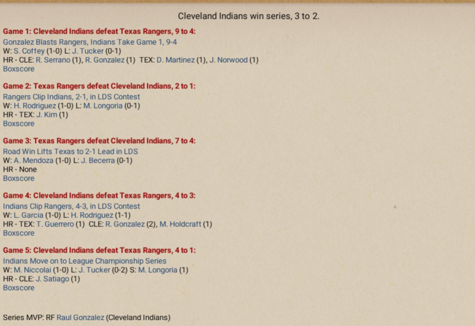 1902 1919 “WELL, HOW ABOUT THAT, FOLKS! The Cleveland Indians are goin’ to the American League Championship Series for the first time in 17 years! That’s right — you heard me — seventeen! It’s only the second time in their long, tortured history they’ve made it this far. Not bad for a ballclub that hasn’t sniffed the postseason in fourteen years. You think people in Cleveland are gonna remember where they were tonight? You bet your rear ends they will! Final score from Globe Life Field: Cleveland 4, Texas 1. And boy, did the Tribe make it interesting. Six innings of absolutely nothing, then suddenly, BAM! A four-spot in the 7th, courtesy of Satiago’s three-run blast. Somebody tell the Rangers bullpen they were supposed to stop the fireworks, not light ‘em! Mike Niccolai went eight strong innings, scattering eleven baserunners like confetti at a wedding, but hey, one run’s one run. And Raul Gonzalez? Series MVP. Guy was hotter than a three-dollar pistol all week. So Cleveland’s reward? They get the Baltimore Orioles in the ALCS. Baltimore has lost only one game this postseason, which means they’re either really good… or really due. Either way, it’s gonna be a helluva show. Once again, your final: Cleveland 4, Texas 1. The Indians move on, the Rangers move home, and I move to the nearest bar. This is Harry Doyle, reminding you: if you can’t make it good… make it long. MAJOR LEAGUE BASEBALL.” |