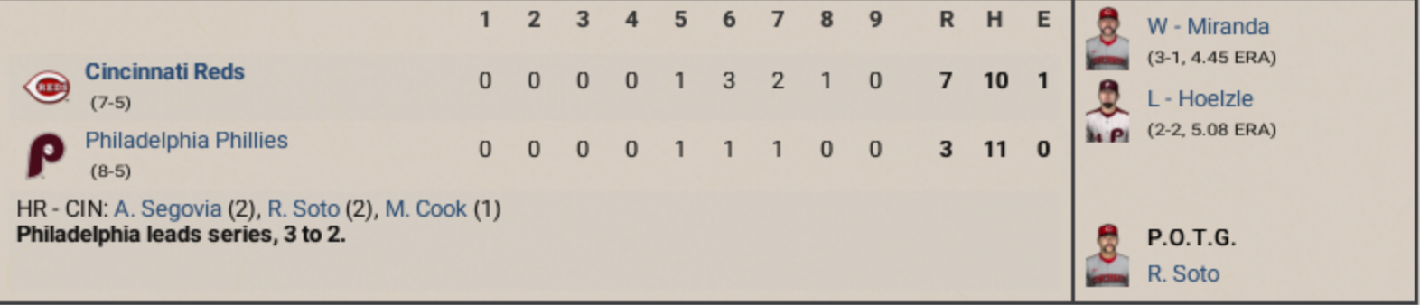 On a crisp October afternoon, the Philadelphia Phillies traveled into Great American Ball Park and came away with a stirring 4–3 victory over the Cincinnati Reds to grab a one-game-to-none lead in this League Championship Series. How about that? The hero of the day—37-year-old right-hander Eric Hoelzle, the wily veteran from Hanford, California. Hoelzle had that fastball darting, the breaking ball biting, and for seven strong innings he handcuffed the Redlegs, scattering just five hits, fanning nine, and keeping the crowd of over 49,000 on edge all afternoon. The Phillies got their thunder early. In the second inning, shortstop Sam Branscome turned on an A. Miranda pitch and sent it deep into the left field seats. That, folks, was a souvenir—and the Phils were on the board. Then in the sixth inning, with the Reds threatening to climb back in, José Torras answered with a mighty blow of his own, a solo home run that silenced the crowd and pushed Philadelphia’s lead to three. But these Reds are never out of it. Down 4–1 late, they scratched and clawed. In the eighth inning, J. Castaneda lashed a two-out single to bring them within a run. The bases were buzzing, the ballpark rocking, and you could almost feel Cincinnati ready to steal this one away. But reliever Dallas Moran reached back for something extra, wriggled out of further damage, and then slammed the door in the ninth for the save. Final score: Phillies 4, Reds 3. The veteran Hoelzle gets the win, Moran the save, and the Phillies take a 1–0 lead in the series. Oh, what a game of inches it was—Worboys cutting off a run at the plate with a brilliant throw from left, Segovia answering back with a cannon of his own to deny Philadelphia a tally, and pitch by pitch the drama building until Moran got the final out. So the Phillies draw first blood here in Cincinnati. Tomorrow, it’s game two, and you can be sure the Redlegs will be fighting tooth and nail to even things up. And there you have it, friends—the happy recap! |