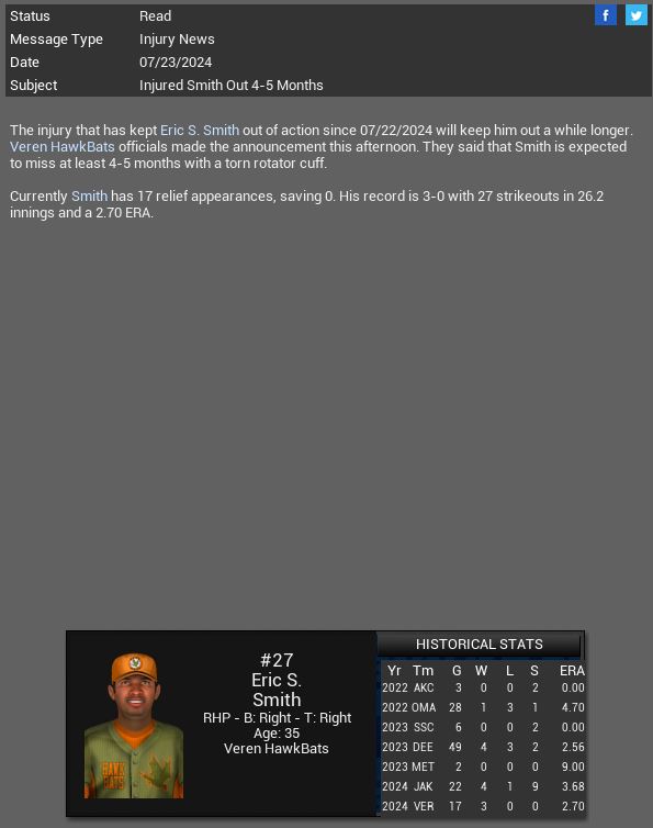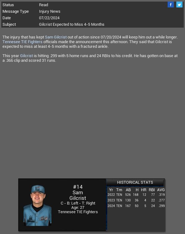 TIE Fighters C Sam Gilcrist will miss the rest fo the season. Panasonic Dragons traded 1B Brandon Belt and minor league RF Zack Morris to the Minnesota Twins for P Zach Lee. Veren will miss RP Eric S. Smith for the rest of the season. Drager Mynocks traded 3B Ronny Rodriguez and a minor league P to the Springfield Isotopes for 2B Maden Voaden.
