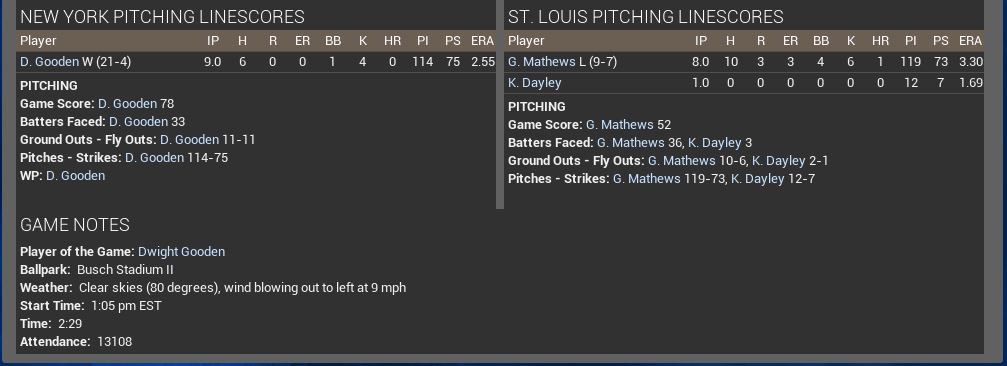 Dr. K was in the zone today, as he goes the distance, strikes out 4 and shuts out the STL Cardinals in the 1st game of a doubleheader 3-0 @ Busch Stadium. Wally Backman was 3 for 4 today as once again he has the hot bat! Funny thing is, the way OOTP scheduled this game, both teams have to get on a very fast plane because the 2nd game is at Shea Stadium.