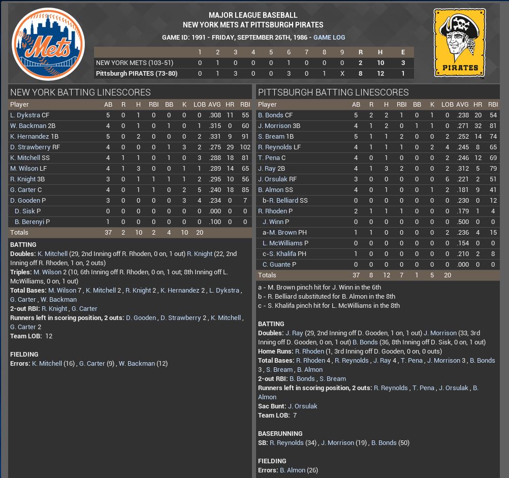 Sometimes you just get one of those games as the PIT Pirates win it over Dr. K and the NY Mets 8-2 @ Three Rivers Stadium. Gooden didn't have it today and 3 errors really put the Mets behind the 8 ball in this one. Mookie Wilson went 3 for 4 in tonight's contest. RP: 103-51 RL: 101-53 (3-1 Win @ PIT) +2