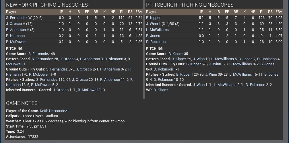 Good game to watch as El Sid becomes the NY Mets' 2nd 20-game winner of the season, as they outlast the PIT Pirates 10-6 @ Three Rivers. Fernandez gives up 4 earned runs in 6 innings, but remains the pitcher of record as the Mets lineup did what it could to give him his 20th win. Keith Hernandez was the main man today, as he went 2 for 4 with 4 RBIs. Backman and Strawberry had two hits each as well. Gary Carter also had a couple of RBIs to his credit. Rubber game of this 3-game set is tomorrow. RP: 104-51 RL: 102-53 (4-2 Win @ PIT) +2