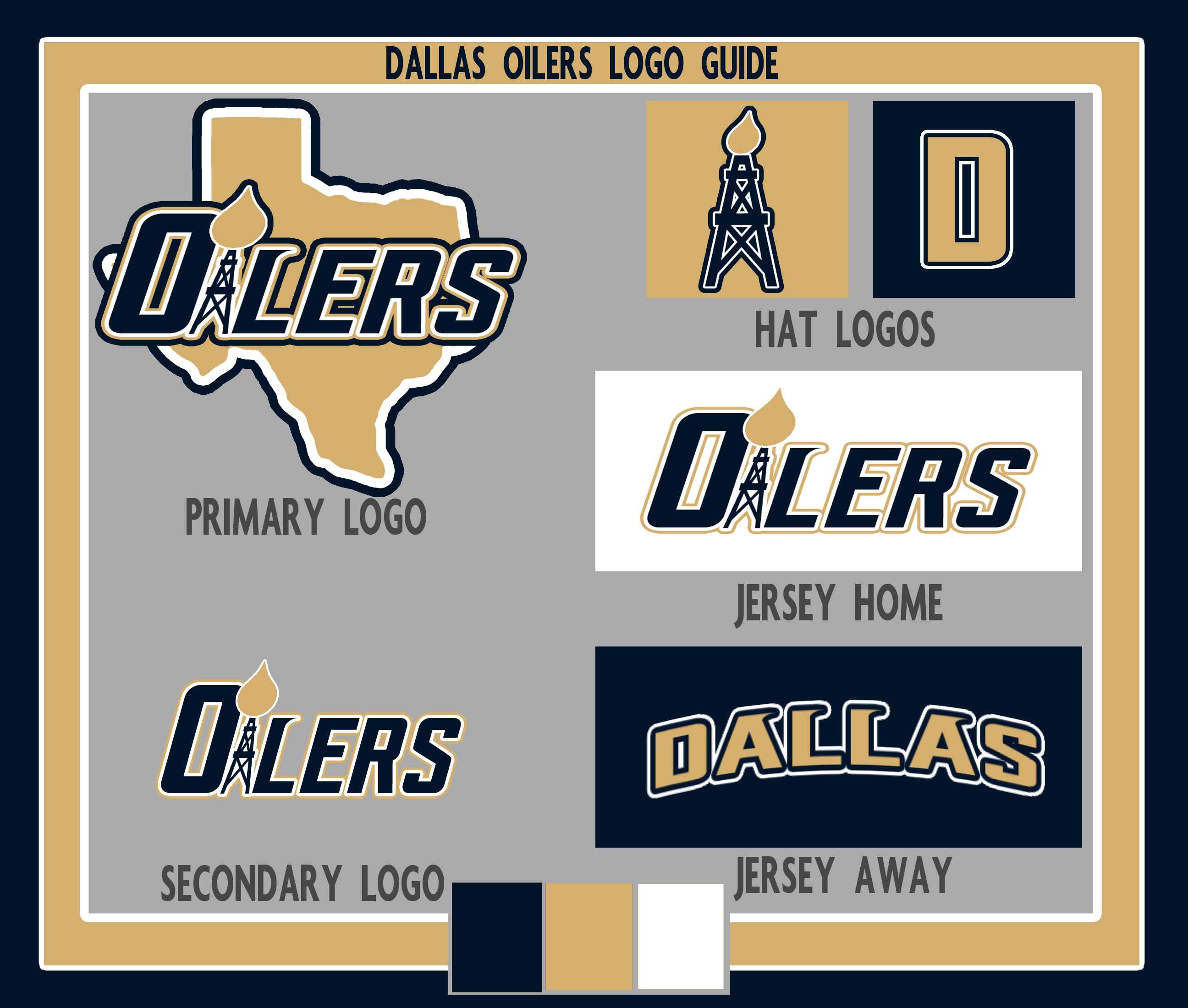 Some of you guys have been wanting some more of these. Here is one hot off the press. The Dallas Oilers. I went with a dark blue and Gold. I used the Tulsa Oilers hockey logo. I redid it with a different font and also added the Houston Oiler logo for the I.