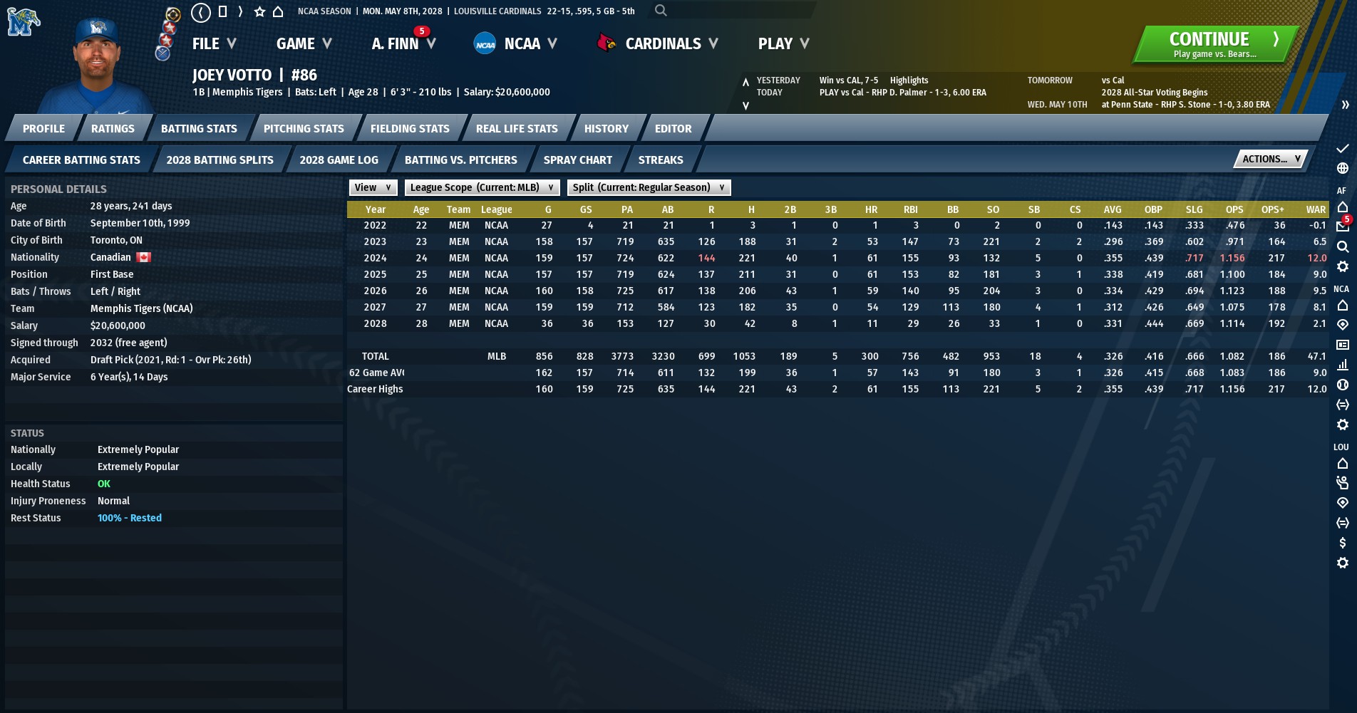 Joey Votto hit a historic home run today -- career blast number 300. "I am happy to be in such elite company. It has been quite a ride so far," Votto said after the game. The Tigers first baseman went 3 for 4 with 1 home run and 4 RBI as the Memphis Tigers won 10-5 over the Notre Dame Fighting Irish. During his 856-game career Votto has batted .326 and collected 1053 hits, 300 home runs and 756 RBIs. |