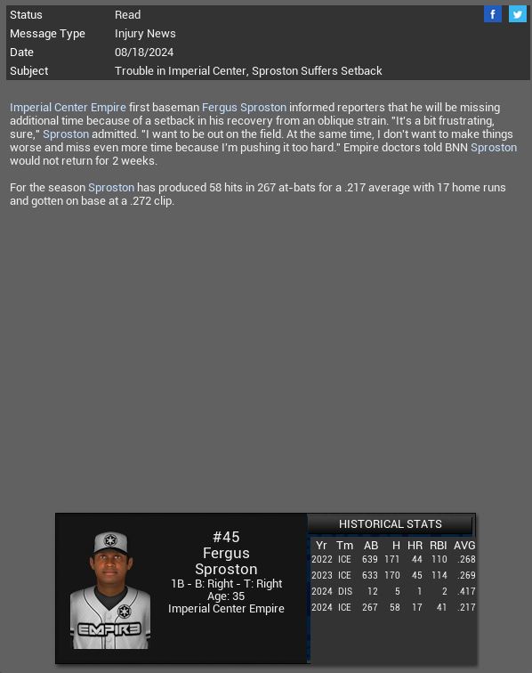 Empire 1B Fergus Sproston will miss 2 more weeks. Twins RP Tyler Gonzales will miss the rest of the season. Atlantis SS Joe Parks goes 5 for 5 vs Panasonic. Delgado RF Fred Turner has a 5 hit game vs Colorotwn.