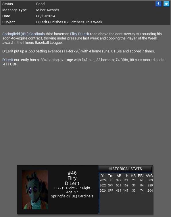 Springfield 3B Fliry D' Lerit is named IBL POTW. Millennium Falcons lose SP Bruce Rondon for 8-9 weeks. Cloud City 3B Joe DeCarlo has 5 hit game vs Panasonic. Minotaurs 1B Adam Giacalone has a 5 hit game vs Republic City.