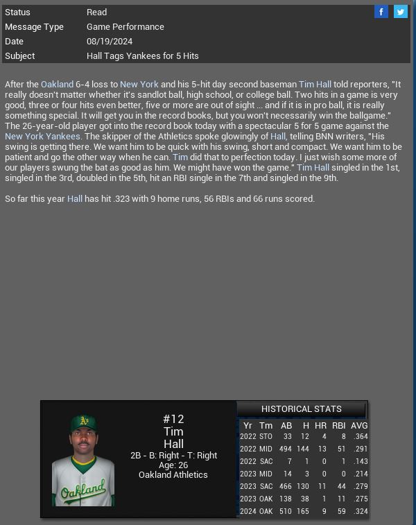 Oakland 2B Tim Hall has a 5 hit game vs Yankees.