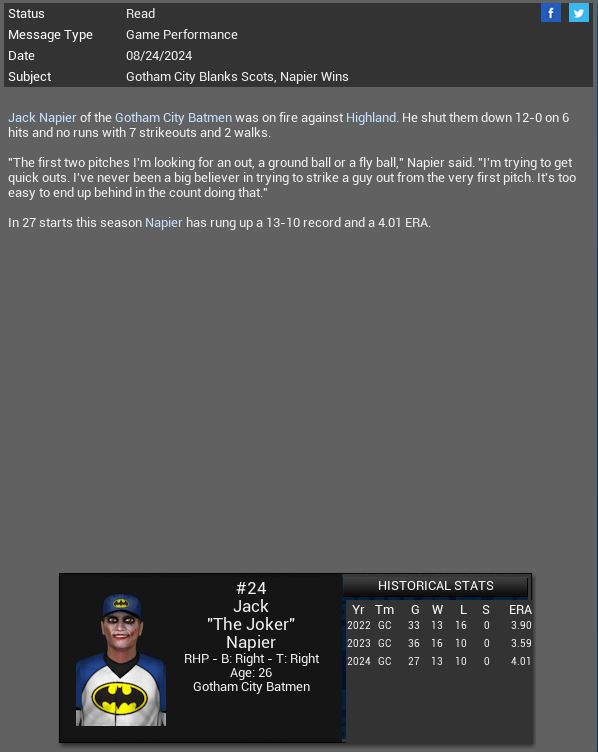 Thrantas RF Richard Logan will miss 4 weeks. Bird City CF Jean-Francois Tougas will miss 3-4 weeks. Cloud City SP Abe Lincoln pitched a 2 Hit CG SH vs Bird City. Gotham City SP Jack Napier pitched a CG SH vs Highland.
