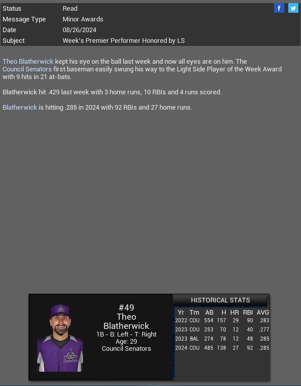 Earl Morris has a 5 hit game vs Sony. Council 3B Adrik Wovchuk has a 5 hit game vs Organa. Stormtroopers SP Zaccaria Anganuzzi pitched a 9 K CG SH vs Chimera. X-Wings CF Jesse Porter has a 6 hit game vs A-Wings.