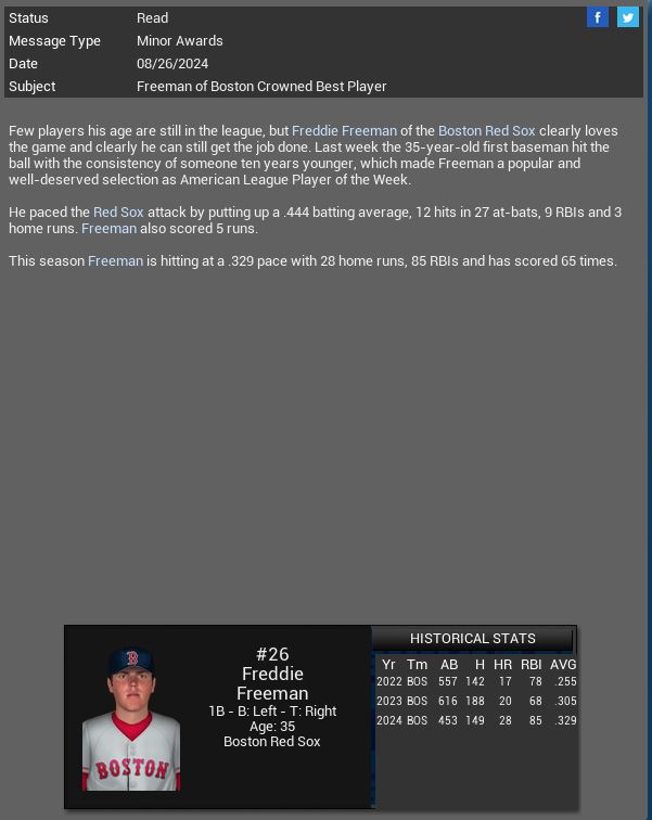 Twins lose SP Matt Henderson for the season. Corvair loses SS Xander Bogaerts for 2 months. Darkside Stormtroopers resign SP Manny Banuelos to a 2 year extension. Free LF Paora Ekala hit for the Cycle.