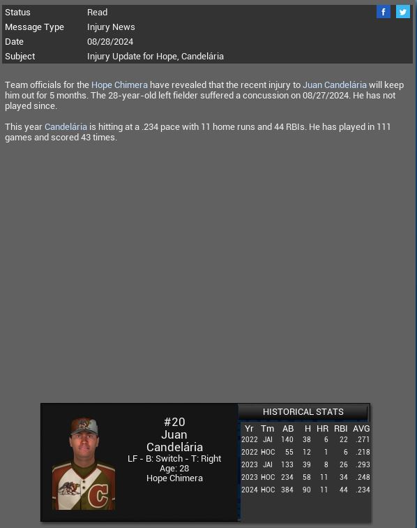 Chimera lose LF Juan Candelaria for the season. Atlantis Sharks sign C Viper to a 6 year extension. Anderson LF Ed Bailey has a 5 hit game vs Batmen.