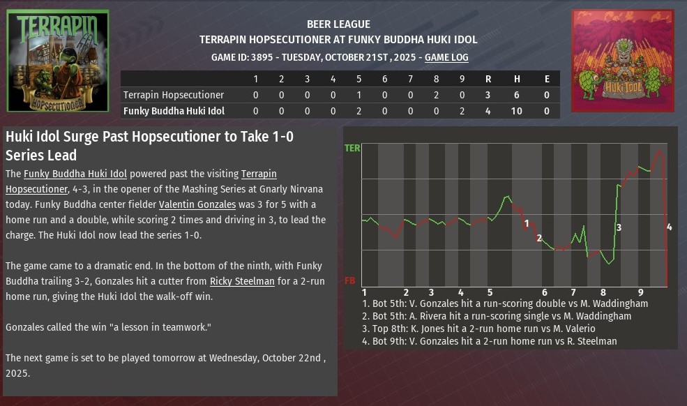 Mashing Series - Game 1: #2 Funky Buddha Huki Idol (99-63, 2nd post season) vs #2WC Terrapin Hopsecutioner (92-70, 6th post season)