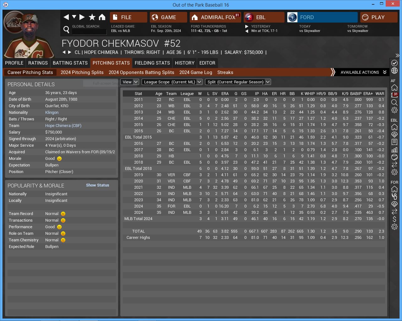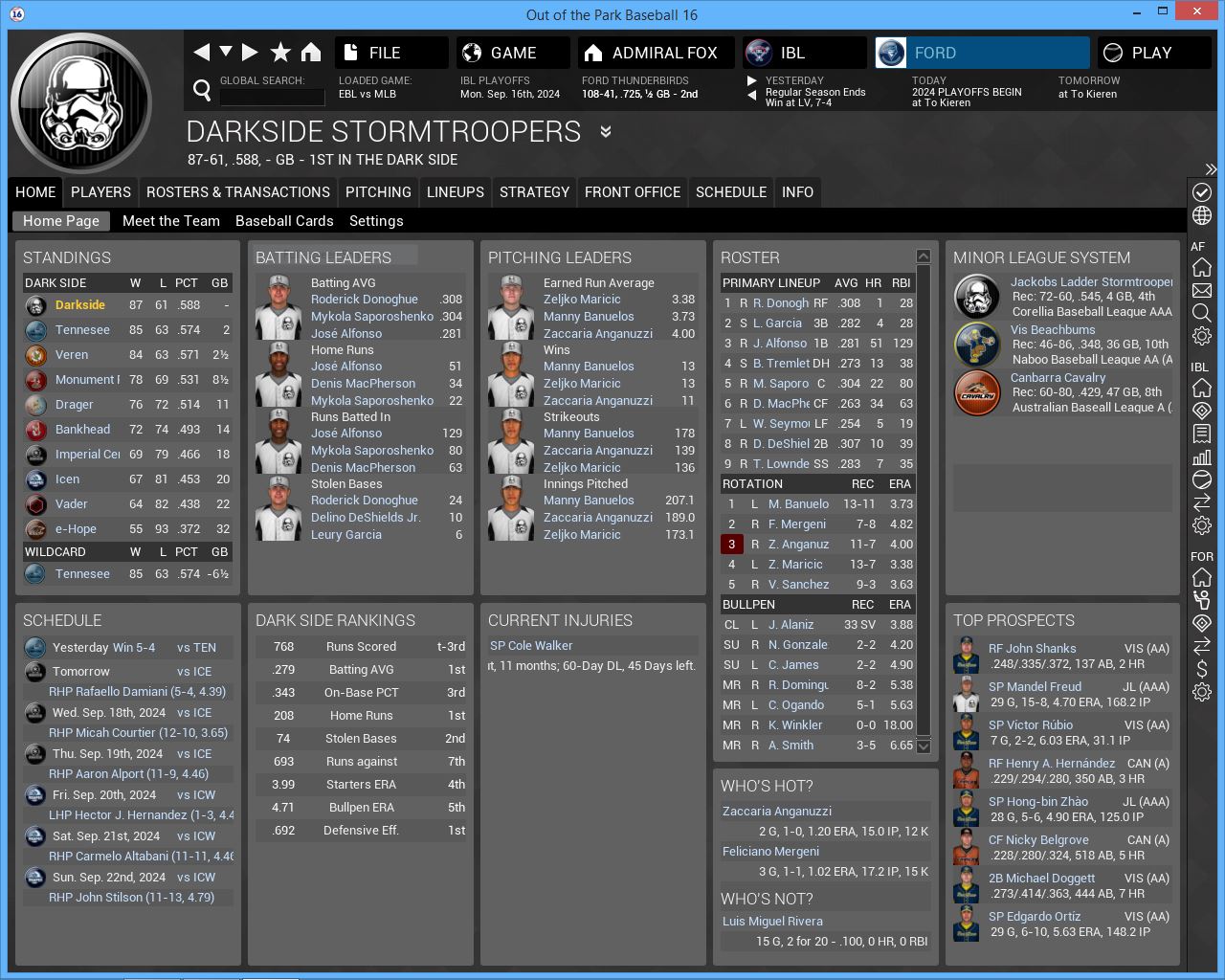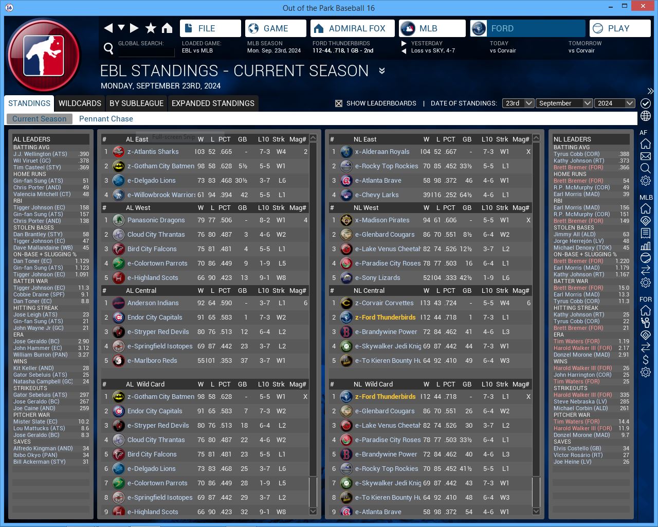 We are back in 1st place by 1 game. Our rotation is set up to have Waters Walker & TBA vs Corvair. I would like to have Bainbridge pitch vs Corvair but he has struggled his last 3 outings. I may throw Alonzo Gonzalez vs Corvair to try to neutralize the Vettes lefty power hitters. Doubtful Cinnamon will lose his job this season but many things need to change in Skywalker.