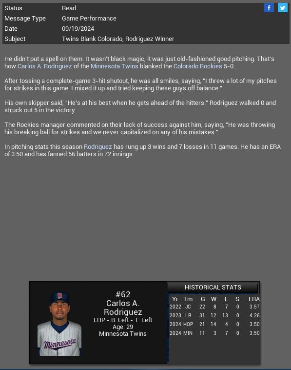 Twins SP Carlos A. Rodriguez pitched a 3 hit 5 K CG SH vs Colorado. A's SP Charles Day pitched a 4 hit CG SH vs San Fran. Bird City rookie SP Bookie Boland pitched a 3 hit 10 K CG SH vs Delgado. Panasonic SP Scott Norris pitched a 3 hit 3 K CG SH vs Colortown.