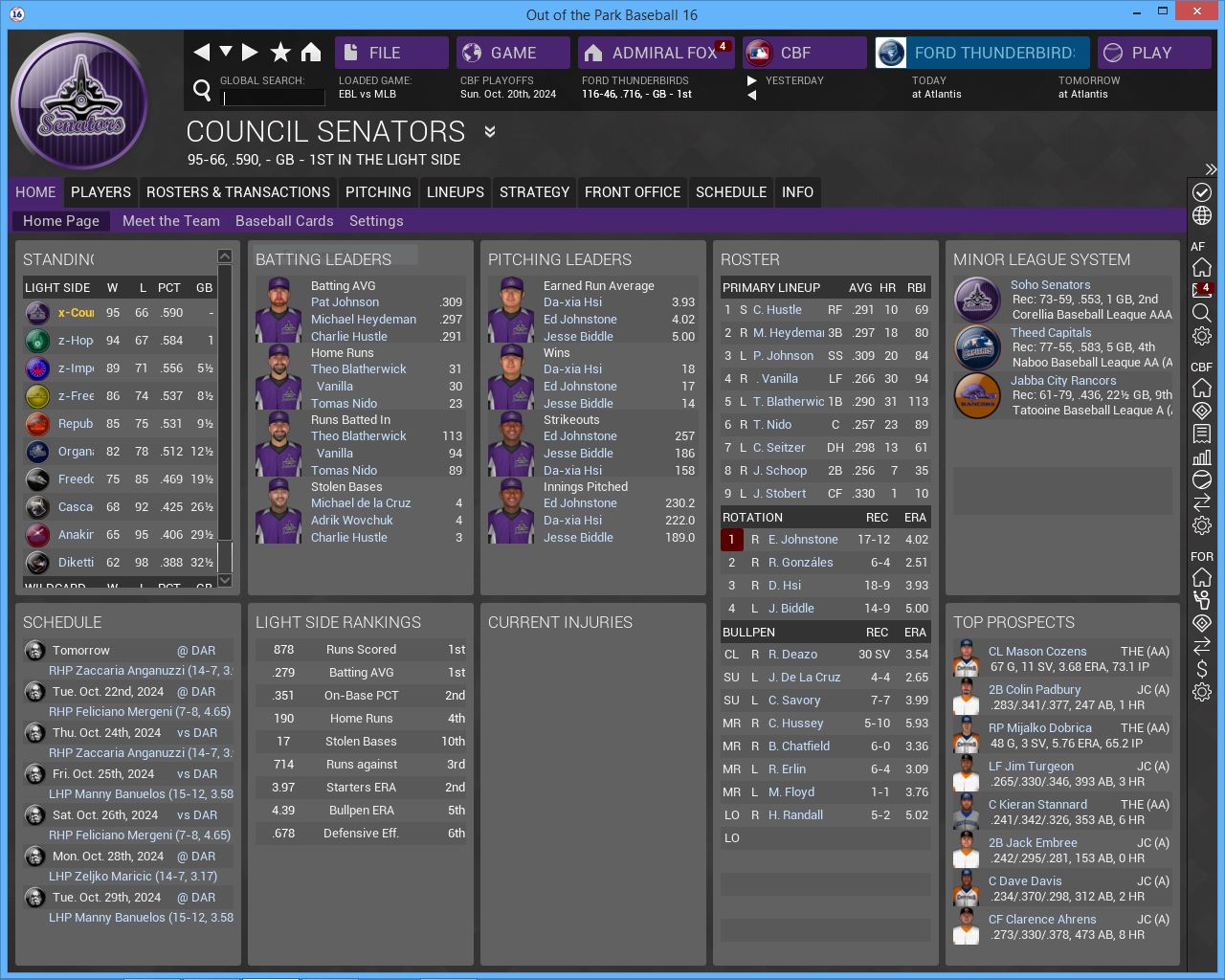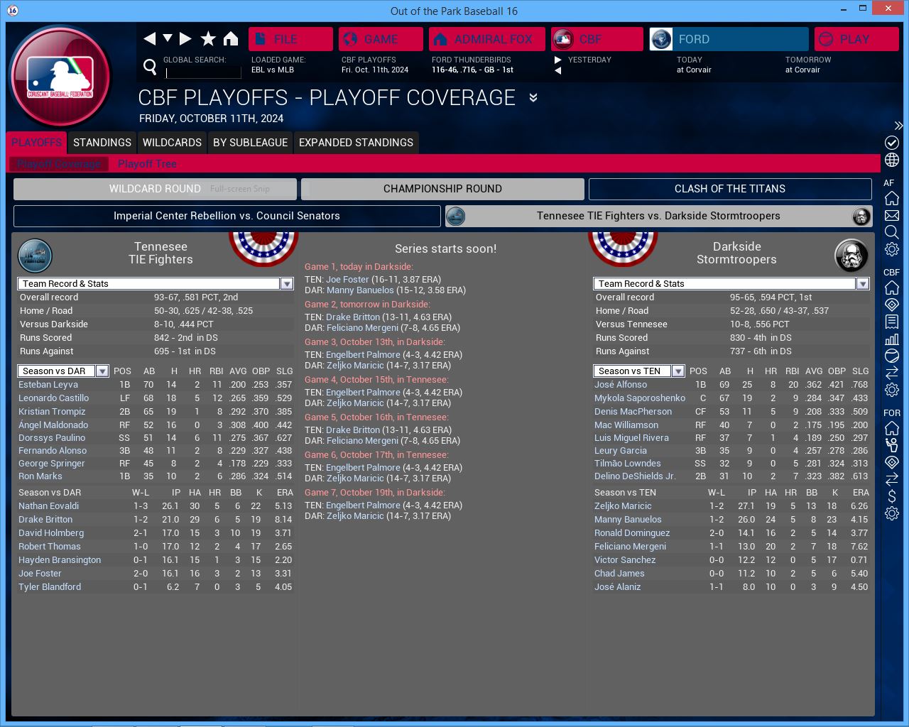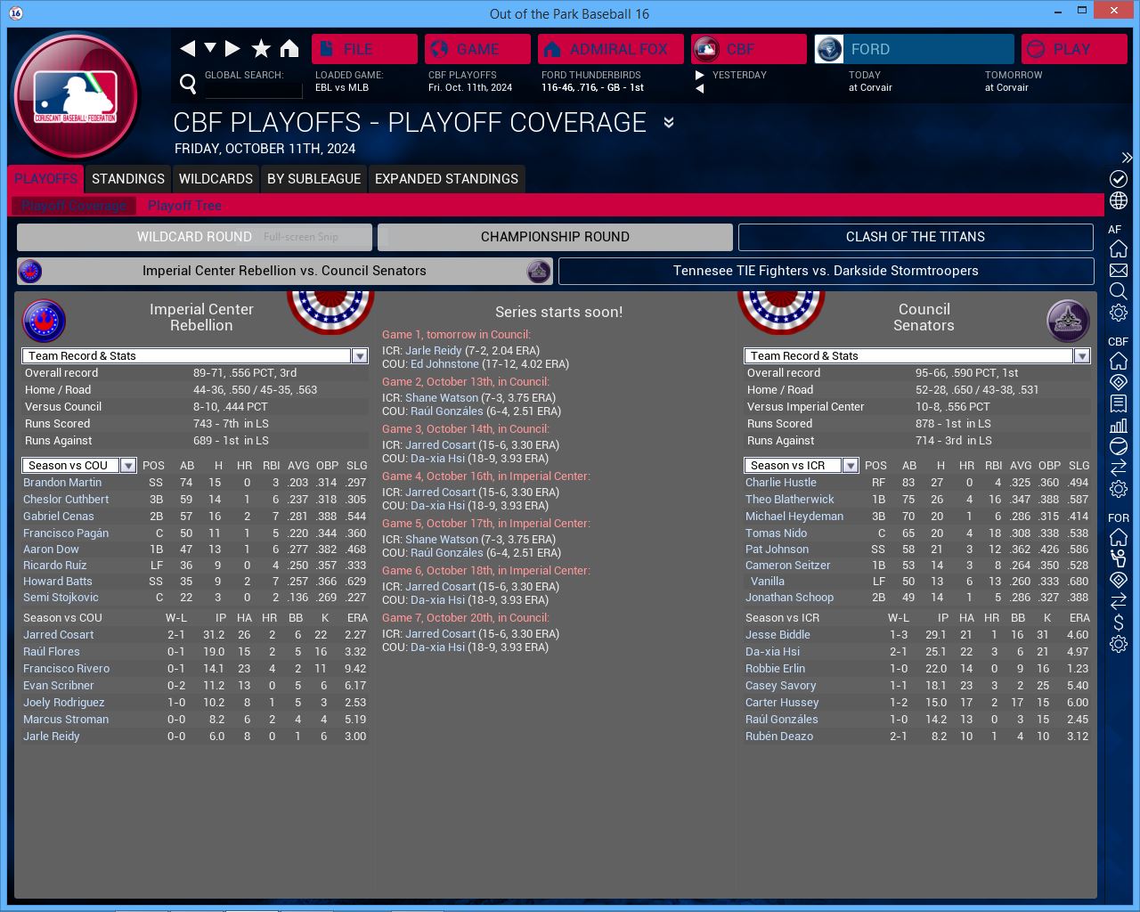 Screwball was very tough, up until the 6th inning. Walker was masterful throughout. I got what I wanted and that was taking both games at home. All we have to do is win game 3 or 4 @ Corvair then we can close it out in Game 5 or 6.