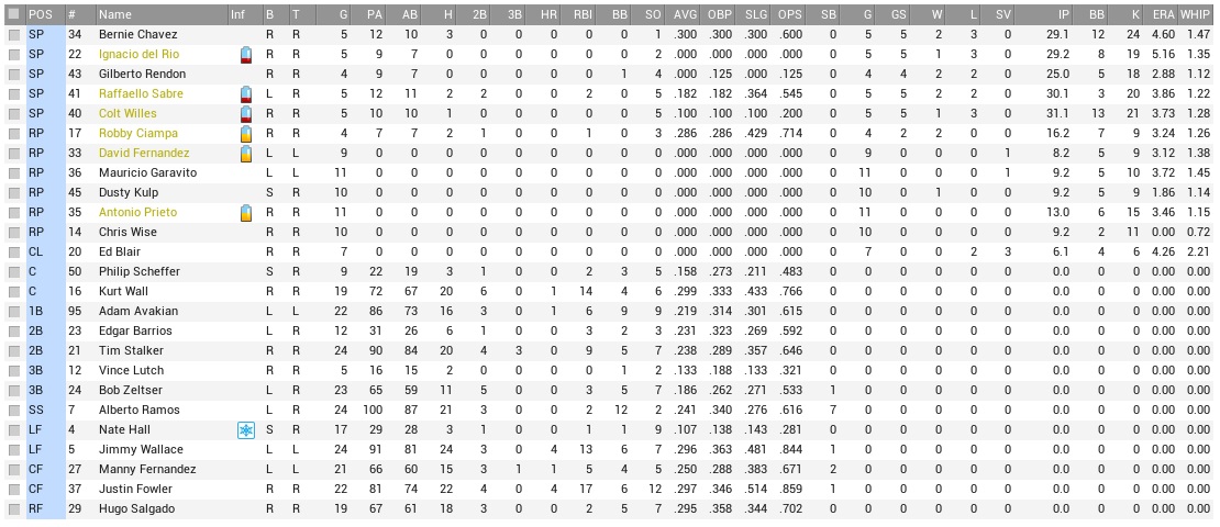 The last-place Critters (…) had their first dibs with the Crusaders, who they had beat 10 times out of 18 in the previous season. Right now, though, the Critters had lost 11 of their last 14 games, and had scored roundabout 14 runs doing so. New York was sixth in runs scored, second from the bottom in runs allowed, but they had real hope that their patented stale brand of baseball would play rally well in Portland… Projected matchups: Gilberto Rendon (2-2, 2.88 ERA) vs. Eddie Cannon (2-3, 4.00 ERA) Bernie Chavez (2-3, 4.60 ERA) vs. Jamie O’Leary (0-1, 5.06 ERA) Colt Willes (1-3, 3.73 ERA) vs. Joe Martin (1-3, 6.20 ERA) Right, left, right. Jamie O’Leary was by now 31 years old and had a 4-11 record in six years as occasionally employed Crusaders swingman. He had needed only one season as a Coon to rack up a 2-11 record in ’29. Him and Yusneldan Delgadillo had amounted to Chris Wise back then, so that trade still looked kind of fresh. Game 1 NYC: LF Saito – 1B J. Lopez – 2B M. Hurtado – C Monge – RF Chavira – 3B B. Moore – CF Veraart – SS J. Brown – P E. Cannon POR: SS Ramos – 2B Stalker – LF Wallace – 1B Avakian – RF M. Fernandez – CF Hall – 3B Zeltser – C Scheffer – P Rendon Superficially, the game started rather well with Gilberto Rendon facing the minimum while whiffing five the first time through. Danny Monge hit a single in the top 2nd, but was doubled off by Bill Moore, and the Coons took a 1-0 lead in the bottom of the inning on Avakian and Zeltser singles, and, well, Eddie Cannon’s wild pitch at one point helped them out, too. The Coons’ 3-4-5 batters all reached with two outs in the bottom 3rd, Manny singled home Wallace, and all seemed well. At least until Hirofumi Saito homered to start the fourth inning, indicating that Rendon was still mortal and had been direly mediocre for all of last season. As if we needed confirmation, Saito homered again his next time up, a 2-out, 2-run homer to right in the fifth that brought the Crusaders into the lead, 3-2. A Ramos Special re-knotted the score at three in the bottom of the same inning. Berto singled to right, stole second after Stalker flew out, then came home on Jimmy Wallace’s single to center. Avakian also singled to center, and Manny found the gap between Ronnie Veraart and Vinny Chavira for an RBI double. Nate Hall cashed a pair and knocked out Cannon with a 2-run single to right before Zeltser hit into a double play against right-hander Keith Black. Ramos singled again and stole second base again off Black in the bottom 6th, but was stranded when Tim Stalker struck out. Those two turned a double play on Brown in the seventh to get Rendon through that inning, which was also his final – he finished with seven each in hits and strikeouts, too, having thrown 101 pitches. Mauricio Garavito, Dusty Kulp, and Ed Blair would finish the game without any silly accidents, and in fact without any silly base runners. 6-3 Coons. Ramos 2-5; Avakian 3-4; M. Fernandez 2-3, BB, 2B, 2 RBI; Hall 2-4, 2 RBI; Zeltser 2-4, RBI; Rendon 7.0 IP, 7 H, 3 R, 3 ER, 0 BB, 7 K, W (3-2); O’Leary was evacuated from the middle game; the Raccoons would face Joe Martin on short rest, which was certainly a wicked move. Game 2 NYC: CF Sung – 1B J. Lopez – 2B M. Hurtado – C Monge – RF Chavira – 3B B. Moore – LF Damron – SS J. Brown – P J. Martin POR: SS Ramos – RF M. Fernandez – LF Wallace – CF Fowler – 1B Avakian – C Wall – 3B Zeltser – 2B Barrios – P Chavez Yeong-ha Sung singled, stole second and reached third when Kurt Wall’s throw hit him in the bum, and came home on Mario Hurtado’s sac fly to give the Crusaders a 1-0 lead in the first inning. That didn’t sound too bad; they were after all bringing a pitcher with an ERA over six, more walks than strikeouts, and on short rest – and that pitcher didn’t allow a hit the first time through the order, walked one, and fanned four. Bernie got bombed for 420 feet worth of Vinny Chavira to start the fourth inning, 2-0, and things were already drifting down the Willamette in my head. Their first base hit would be an Avakian double off the fence in leftfield with two gone in the bottom 4th and nobody out. Avakian was safe, also hurt, and was replaced by pinch-runner Hugo Salgado, who scored on Wall’s bloop single to shorten the gap to 2-1 before Zeltser popped out. The Crusaders hit four singles through the infield gaps to score two runs – RBIs for Hurtado and Chavira – in the fifth inning, burying the Coons even deeper. Bottom 5th, Barrios walked, was bunted to second base by Chavez, and … and that was the point where the Crusaders hauled in their pitcher after 4.1 winning innings. In came *O’Leary* and right away gave up a single to Berto and a close RBI double that dropped near Keith Damron, a player from the Jimmy Wallace School of Defense, and put the tying runs in scoring position for said Jimmy Wallace, who hacked his way to 0-2 before getting drilled right in the knee. He went to the ground at once and had to be walked off the field by an annoyed Dr. Chung, which took several minutes, because our trainer initially couldn’t be arsed to bother about another clearly simulating player and just casually kept smoking with one arm hanging over the dugout’s guard rail. The Coons moved Salgado to the outfield at this point, with Fernandez to leftfield, and brought in Vince Lutch as new first baseman, batting third. It was what it was… O’Leary walked Fowler with the bases loaded, pushing home Berto with a run, 4-3. Salgado hit a sac fly to tie the game, but Wall struck out, stranding two. In turn, the flogging of Bernie Chavez continued, with Damron and Brown reaching base to begin the sixth inning. Saito and Sung had poor outs, but Johnny Lopez hit a 2-run single, then scored on Hurtado’s double to left, knocking out Chavez after 5.2 innings of 7-run (six earned) ball. Monge lined out against Chris Wise to finish t