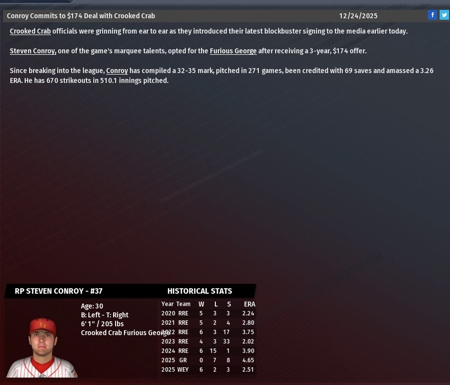 Free agent reliever Steven Conroy has agreed to a 3 year / $174 contract with Crooked Crab Furious George
