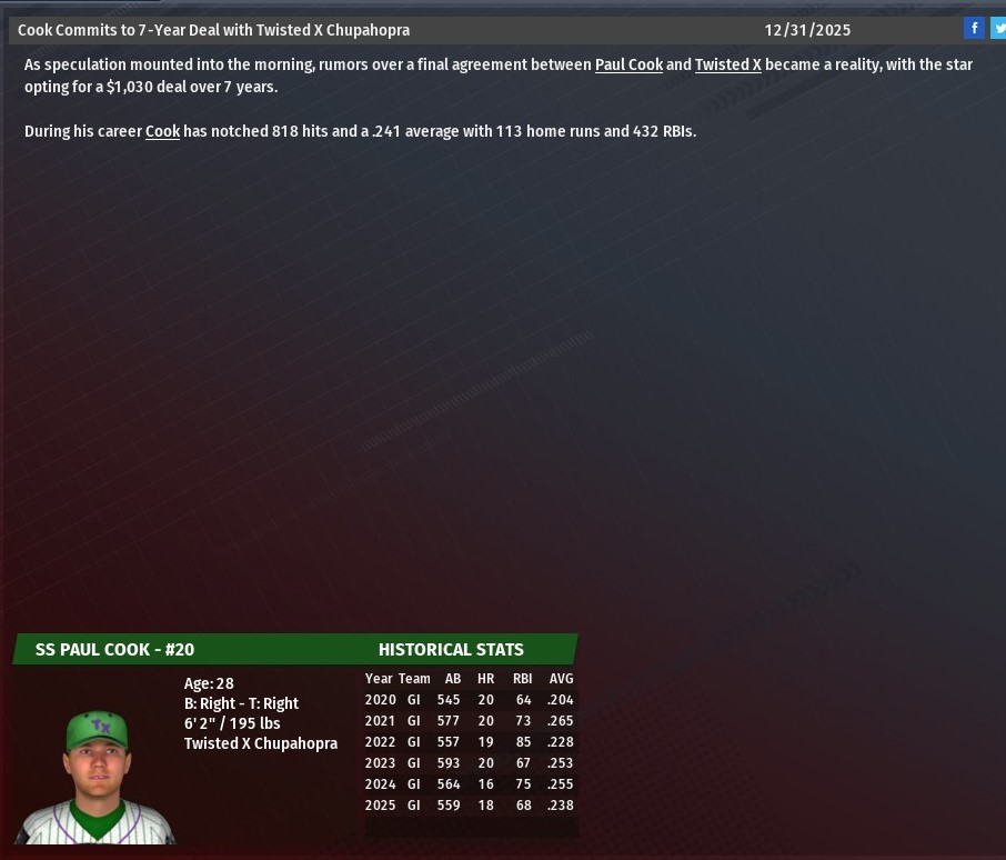 Free agent shortstop Paul Cook has signed a 7 year / $1030 contract with Twisted X Chupahopra