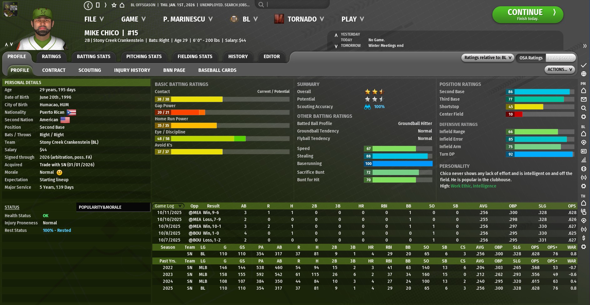 Sierra Nevada Narwhals have traded second baseman Mike Chico to Stony Creek Crankenstein in exchange for reliever Keith Santore