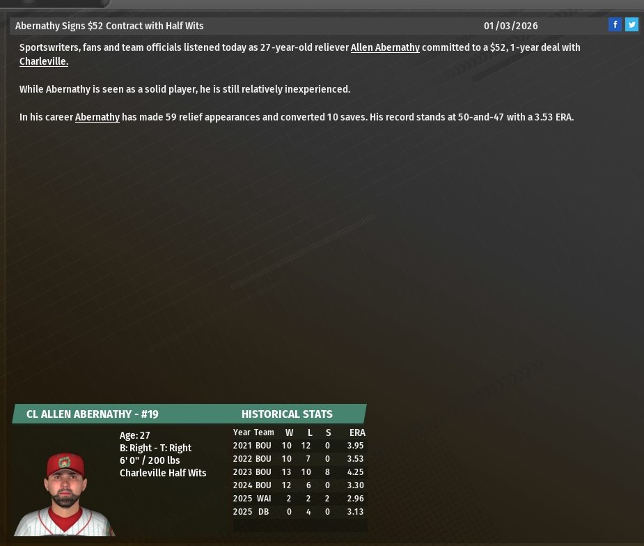 Closer Allen Abernathy has signed a 1 year / $52 deal with the Charleville Half Wits