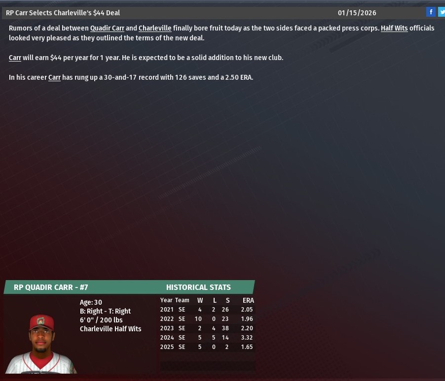 Palmetto Ghost Rider have traded shortstop Nolan Coburn and reliever Kevin Carter to the Charleville Half Wits in exchange for reliever Malachi Chatman and second baseman John Bargender