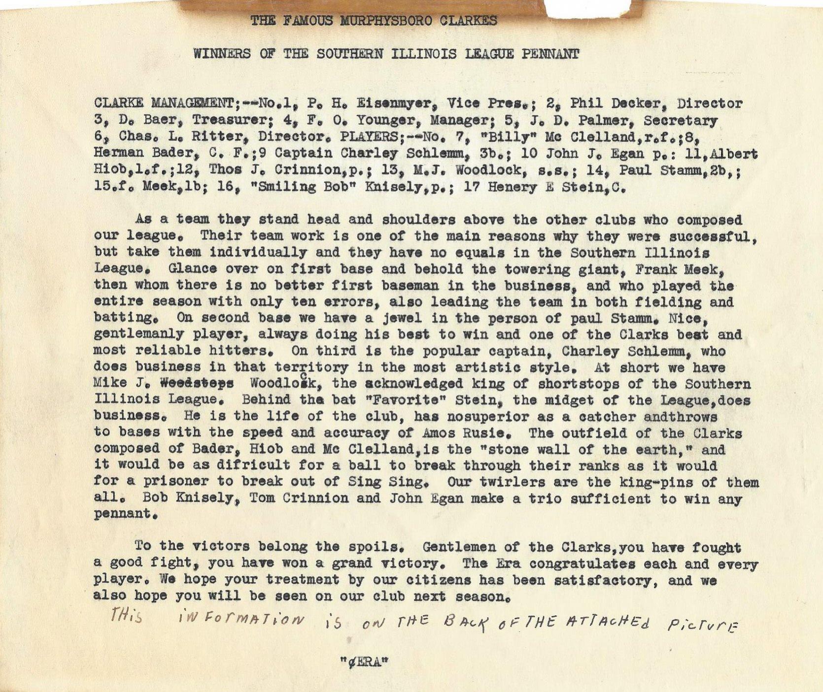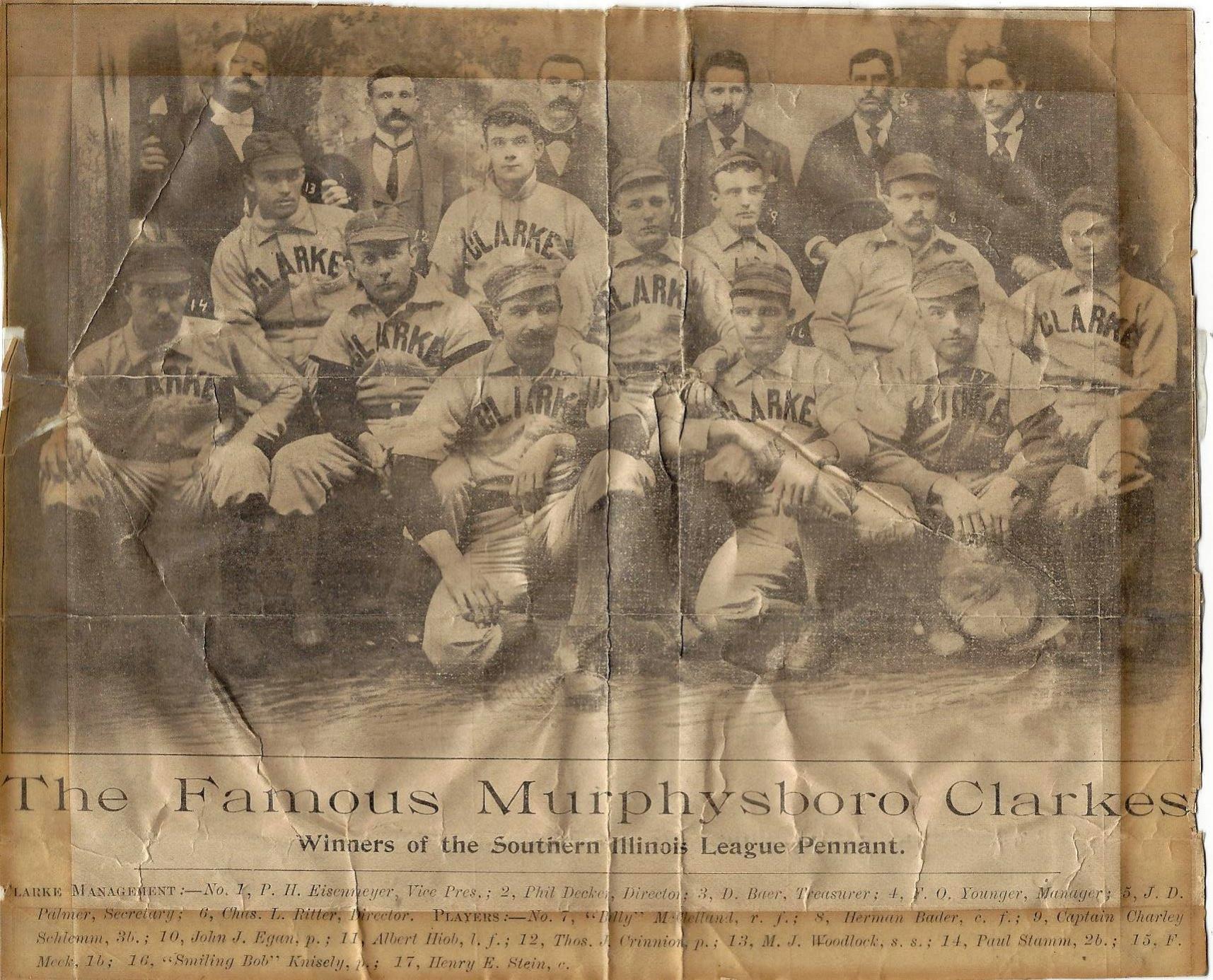 I was able to locate a photo of Frank "Dad" Meek, a shortlived major leaguer for the 1889 St. Louis Browns. He was a well-known player in the Illinois-Missouri area and starred for the Murphysboro Clarkes. I contacted the Logan Historical Society and they were able to provide a team photo of the Clarkes and a player list. Henry Stein, who I recently located is also pictured in the photo.