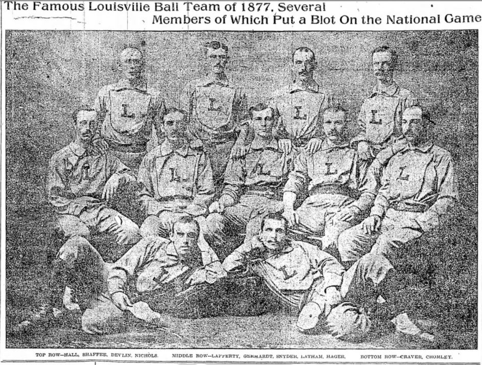 I was very surprised to find a team photo of the ill-fated 1877 Louisville Greys in the July 17, 1910 Louisville Courier-Journal. Al Nichols, one of the four members of that club who was banned for game fixing is pictured in the top right of the photo.