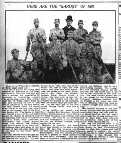 I located two more missing players. William Hyndman and Bill McCaffrey are both pictured in a team photo of the 1886 Wilkes-Barre Barons that appeared in the June 18, 1924 Wilkes-Barre Record.