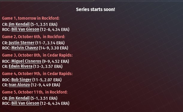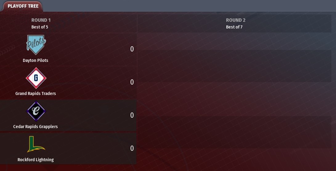 American League Dayton Pilots (91-71) vs. Grand Rapids Traders (96-66) National League Cedar Rapids Grapplers (88-75) vs. Rockford Lightning (98-64) Note: Dayton is the only team in the final four to ever reach the World Series. The Pilots fell to the St. Louis River Walkers in the inaugural World Series in 2018. |
