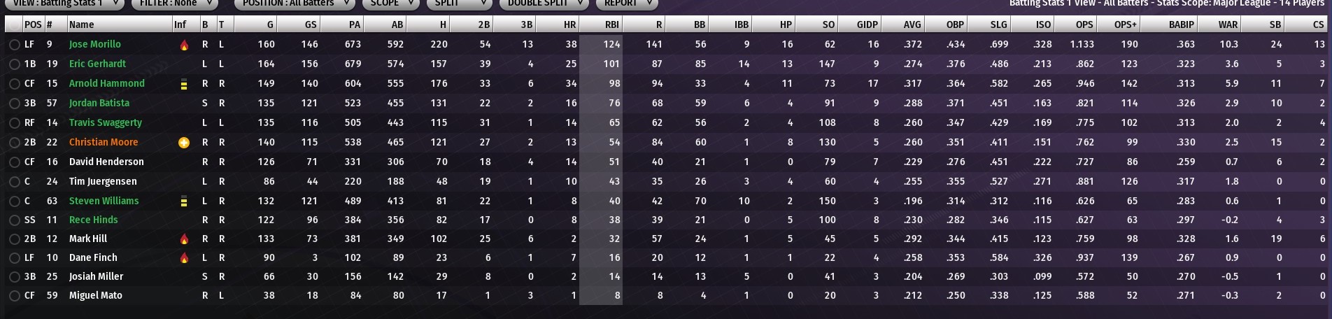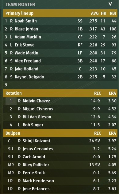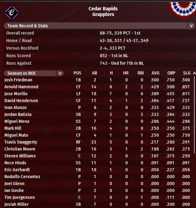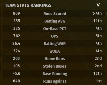 But I pretty much tell him to back off, I am the GM and manager and pretty much unfireable. I've got a couple of different directions I could take the team in the offseason. In a perfect world, some major injuries probably cost me 15-20 wins, so better health, a couple of key additions and key players performing like they should, and I expect to once again be a contender. But every team says that in the offseason. |
