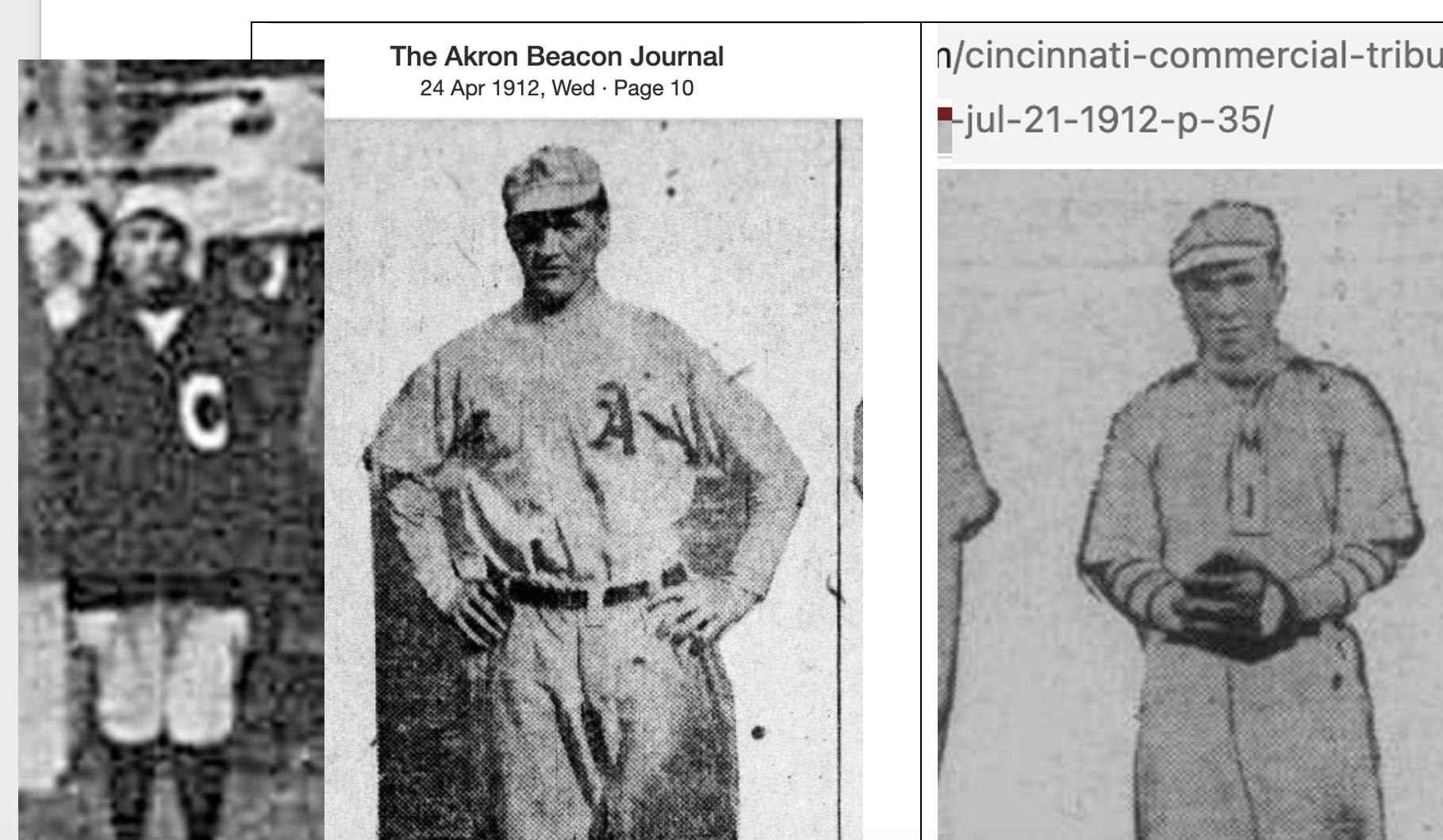 I have a possibly identity - William O'Connell, a minor leaguer who was passed around between clubs in the spring of 1913, playing a few games with Waterbury in early May, before refusing to join the Columbus club. He drops out of the news right around the time Exeter debuts with Covington. At the end of the season, several members of the Kansas City Federal League club (to which city the Covington club transferred in season) were identified playing in a game against the club from Kokomo (IN). The players were identified as Hogue, Hicks, Badel and O'Connell at shortstop, the position Exeter played for Covington/Kansas City. Here is the photo of Exeter (on the left) compared with two photos of O'Connell from 1912. Any opinion as to whether they are the same person? Also, I've found the Covington photo printed in two different newspapers (one contemporary, one many years later), as well as being shown in a documentary about the club, and connected to a bar in Covington that celebrates the club. Does anyone have a more clear version of the photo than what I have shown here? |
