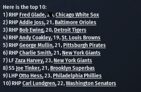 As we head into the start of the 1902 season, the top-10 prospects list, along with overall team farm system rankings, is out. The Americans did not place anyone in the top-10, and are ranked 10th out of 16 teams overall.