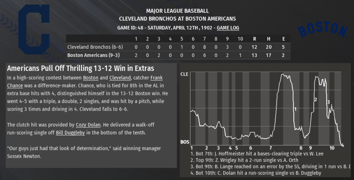 Game 12: This was a slugfest, with the teams combining for 25 runs and 37 hits. In the end, the Americans (9-3) topped the Bronchos (6-6) by a score of 13 to 12. Sam Leever went 6 1/3 innings allowing 9 earned runs on 14 hits and 2 walks (Game Score of 9) before getting pulled for Al Orth (1-0) who lasted the final 3 2/3 innings (3 earned runs on 6 hits and 3 walks) to pick up the win. Watty Lee suffered a similar fan, going 6 1/3 innings in which he allowed 10 runs (8 earned)on 12 hits and 2 walks; Game Score of 12. Bill Donovan pitched a scoreless 1 2/3 innings, but Bill Duggleby (0-1) was tagged with the loss after allowing 3 runs (1 earned) on 2 hits and 2 walks. Five Boston players had at least 2 hits, led by Frank Chance (4 for 5, Double, Triple, 3 Runs, 4 RBIs), Fred Clarke (3 for 6, Double, 2 Runs), and Bill Lange (3 for 6, 1 Run). In the losing effort, Zeke Wrigley (4 for 6, Triple, 1 Run, 4 RBIs), Jimmy Sheckard (3 for 6, Double, 1 Run), and Dusty Miller (3 for 6, Double, 2 Runs) played well. Player of the Game: Frank Chance (Season: #2 / Career: #3) Game 13: A night after tossing an inning of relief, Bill Donovan stymied the opposition to lead the Bronchos (7-6) to a 7 to 3 victory over the Americans (9-4). In picking up the win, Donovan (3-1) allowed 3 runs (2 earned) on 7 hits and 5 walks; Game Score of 61. The normally reliable Noodles Hahn (2-2) had an off night, giving up 7 runs (6 earned) on 13 hits and 1 walk; Game Score of 37. Ed Delahanty (4 for 5, Double), Bill Donovan (2 for 3, Double, 3 RBIs, 1 SB), and Joe Sugden (2 for 4, Double, 2 Runs) led the team to victory. Fred Clarke (1 for 3, 2 RBIs, 2 Walks) and Frank Chance (2 for 5) were solid at the plate in the losing effort. Player of the Game: Bill Donovan Game 14: A close game throughout that ultimately slipped away in the 9th inning, with Cleveland (8-6) topping Boston (9-5) by a score of 10 to 6. Jim Hughes (4-0) went the distance, allowing 6 earned runs on 7 hits and 5 walks (Game Score of 46) to pick up the win. In the loss, Cy Young (2-2) pitched 8 1/3 innings in which he allowed 10 runs (9 earned) on 13 hits and 2 walks; Game Score of 19. "Big Ed" was a power at the plate again, as Delahanty went 4 for 5 with a Double, 1 Run, and 2 RBIs on the night. George Van Haltren was solid at the dish, smacking 2 Doubles on his way to a 2 for 4, 3 Runs, 1 RBI, 1 Walk night. Player of the Game: Ed Delahanty