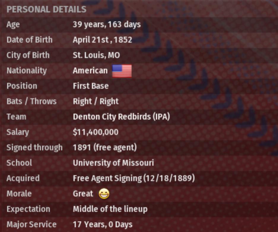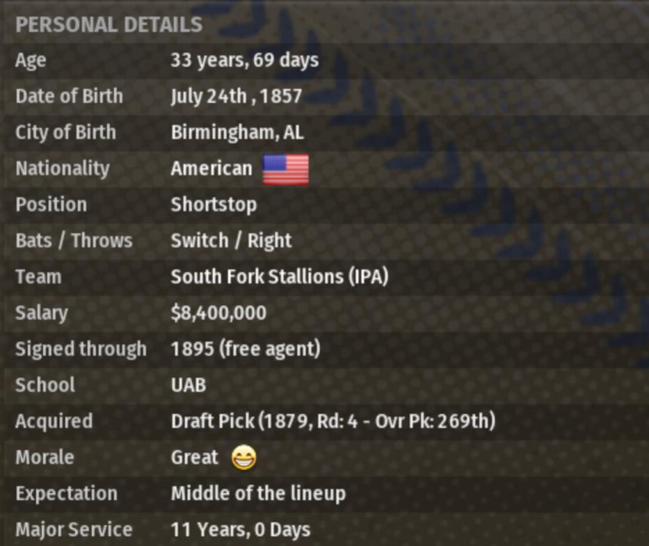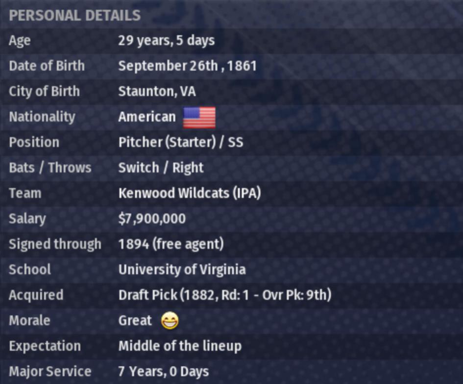 Walton and Freeman are both signed through 1892, while Zebulon Morse is signed through 1891. Simon is not yet up for perhaps testing free agency, but could be sometime after 1891, it seems. Jethro himself might just be up for free agency or retirement within the next several years. And Holmes also looks to be potentially available for testing free agency sometime after 1895's IPA season, if he's actually still active as a player then. As for Barrett and Tanner, it might be at least 1893 or 1894 before they can potentially test free agency here, I think. Of course, I could be wrong, you know, but that's what I think here, in any case, at the present time, jg2977. CD out.