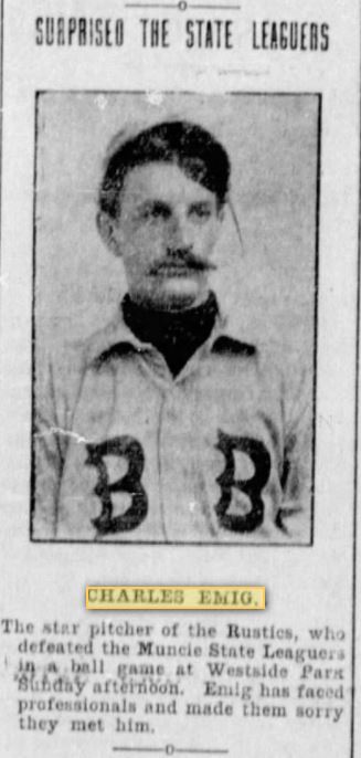 I found one of my most wanted guys, Charles Emig, who lived to 100 years old and pitched one game for the 1896 Louisville Colonels. His photo appeared in the May 1, 1900 Muncie Star Press. A note in the game recap from the previous day confirms it is the same guy as the major leaguer.