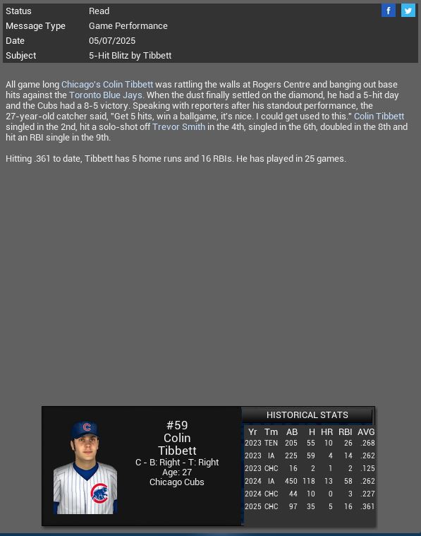 Cubs rookie C Colin Tibbett has a 5 hit game.
