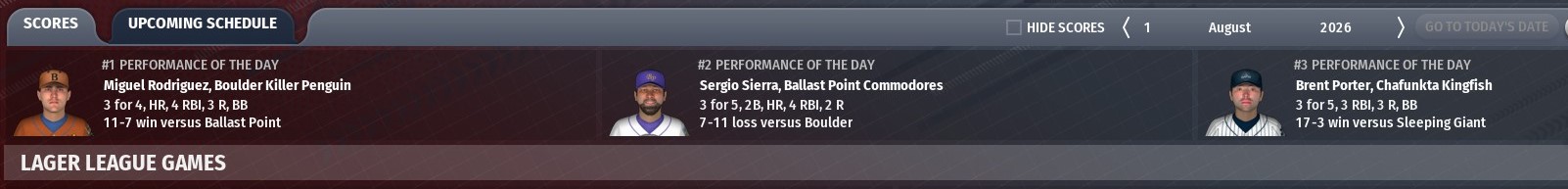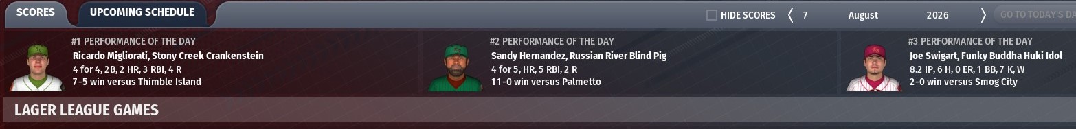 Lager League - Pilsner Division: Weyerbacher Blithering Idiot - a solid 15-8 month of July has the Blithering Idiot still in command of the division with a 4.5 game lead. Troy Daniel is settling into the number 1 starter role, with a record of 8-3 and a 1.91 ERA to this point. Lager League - Kolsch Division: Scorched Earth Giant Killer - the Giant Killer lived up to their Scorched Earth name in July as they burned through the competition to the tune of a 21-2 record. Thanks to their nearly perfect month, they have extended their division lead to a massive 19 game lead. Starter Mike Sikorski is enjoying his best season ever, already matching his single season best in wins with a 13-3 record. Lager League - Helles Division: Sierra Nevada Narwhals - the Narwhals had an impressive month, going 17-6 to take a 6 game lead into August. Youngster Tyler Neubert has stepped into the number 2 starter role and run off a 4-1 record and a 1.13 ERA to help the cause. Lager League - Tripel Division: Daft Badger Hoppypotamus / Meadowlark Mob Barley - the combination of a 4 game Daft Badger losing streak and a 5 game Mob Barley winning streak to end the month put the two teams on equal footing atop the division at 54-45. For Meadowlark, the recent acquisition of ace starter Amine Brisset should help their efforts for a pennant; and the emergence of rookie centerfielder Dave Miller (2 home runs, 29 RBIs, .370 average) bodes well for the future. Stout League - Porter Division: Funky Buddha Huki Idol - an 18-9 month of July kept the Huki Idol in solid control of the division with a 6 game lead as they seek their second straight division crown. First baseman Alejandro Rivera is doing his best to make that happen as he has cranked 17 home runs, with 60 RBIs and a .338 average. Stout League - Dunkel Division: Four Hands Typhon - a so-so month of July (14-12) was a bit of a let down for the Typhon and their fans, but the team still enjoys a solid 10.5 game lead in the division. Starter Mike Hunter continues to cruise along with a record of 11-5 and a 2.54 ERA. Stout League - Eisbock Division: Kona Pipeline - despite a 13-13 record in July, Kona still holds a 4 game lead in the division over powerhouse Russian River. Multi-MVP Pablo Landeros continues to show why he is one of the best in the league, swatting 22 home runs to this point, with 73 RBIs and a .302 average. Stout League - Altbier Division: Tattered Flag Man of War - Tattered Flag is using a top notch speed game (first in the league in stolen bases with 103, and first in the league in base running at +20.6) to sit atop their division with a 3 game lead as the calendar turns to August. Youngster Mike Holguin is settling in to the lead off role, batting .313 so far, with 33 doubles, 61 runs scored and 27 stolen bases. |