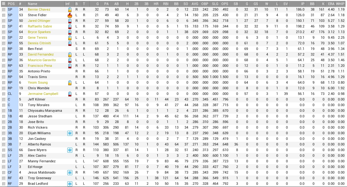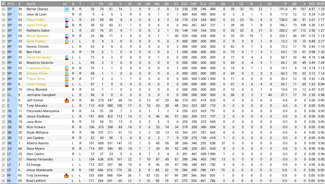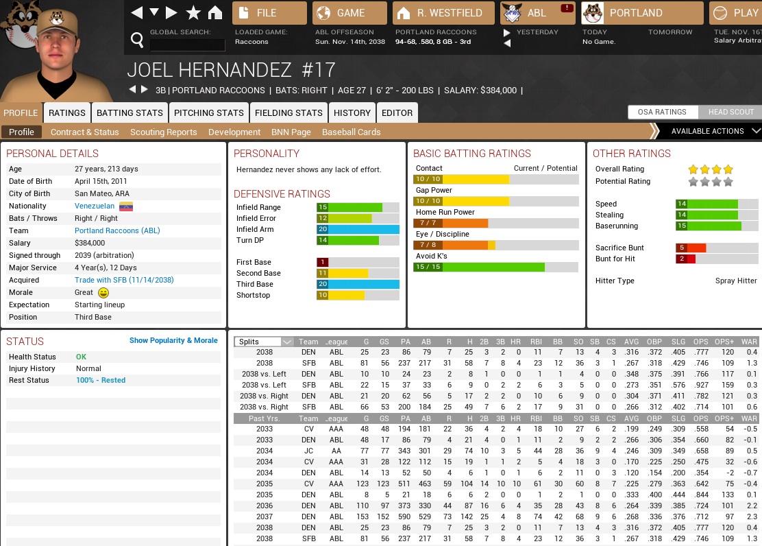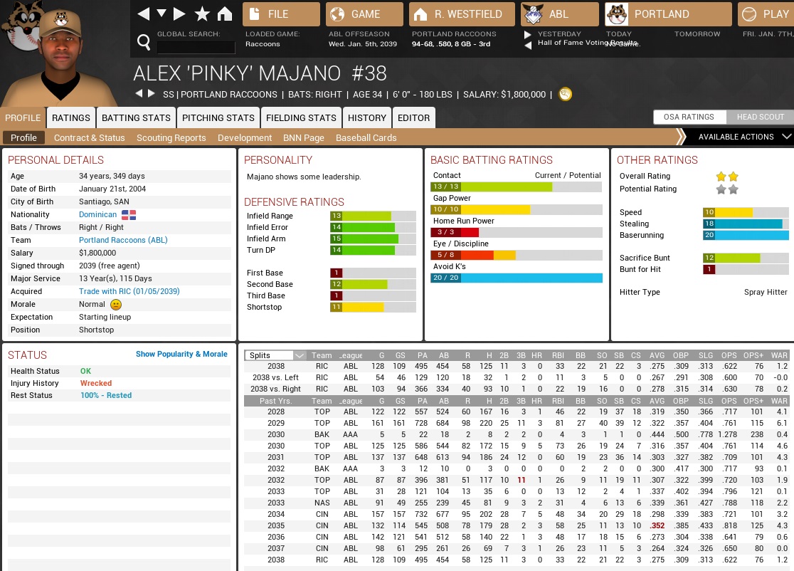 +++ November 14 – The Raccoons trade for the Bayhawks’ INF Joel Hernandez (.265, 18 HR, 161 RBI), with San Francisco receiving a pair of 21-year-old AA pitchers, Carlos Garcia and Pete Boring. +++ Being right-handed, Joel Hernandez was a perfect match with Alberto Ramos at the hot corner. He was about a league-average hitter most of the time, and also fit in neatly with a team that continued to be terror on the basepaths. The two pitchers that San Francisco received figured to be nowhere near the prospect ranks. Boring was the 2035 Nick Brown Memorial Pick, the 11th round left-hander that we usually released three years later. Garcia had been signed out of Brazil for all of $21k and could still turn into a starting pitcher, but right now he was mostly abundantly wild. We were very, very happy with that trade! At this point, most of the focus was on straightening out the pitching staff, because we were entirely happy with our outfield and catchers. There was maybe room to bring in another first baseman, but they’d be expensive, and somebody’s gotta bat seventh, right? But between Stedham, Cosmo, Williams, Berto around the diamond, Hernandez as backup and one of the youngsters, perhaps, as sixth infielder, we were pretty good even in the infield. The pitching staff though – oh boy. After the free agency date, the Raccoons had seven starting pitchers toiling on the expanded roster – Jose de Leon was not included, having already been reassigned to AAA along with Chris Womble, neither of which figured into our Opening Day plans. There was Bryce Sparkes, who was probably going to be the Opening Day starter and thus doomed to suck in ’39, which was how things worked around here, didn’t they? Bernie Chavez and Raffaello Sabre were probably also givens. Both made $2M each and would hang around for a couple more years. I had little doubt that Bernie would recover and post another good season in 2039, because he had always been up and down, and a better defense on the infield would surely help him. His ERA had been up 119 points in ’39, but his BABIP had also gone up 40 points, so there was that. Then it got dicey. What do expect of Steve Fidler, who was a neat surprise after being brought up in the summer. He posted the best ERA on the staff (but in only 138 innings) and had surely scratched himself out a spot in the rotation, right? He had gotten that BABIP that Bernie got in ’37 and prior years, so the defense had been tight for *some* people. (Then again, Fidler was absent while Berto was still feeling out the hot corner, but could that amount to 40 points’ difference?) His scouting report looked pedestrian. Scout Guy rated him 11/12/13, which was not something to evoke excitement. It was barely better than Ottie, and oh boy, Ottie. Ottie had suffered from the same fate as Bernie this year, getting no D behind him and seeing his BABIP go up 35 points. Add in that he is erratic and walked 4.2/9 (up 0.6 from ’37) and the picture begins to be colored in. A shored-up defense might help Ottie, but were we ready to wait for him to come around? Then there was Jose Alaniz, brought over in the Miners trade earlier. He was a groundballer, so he’d like to see Elijah Williams at short for sure. He was not a strikeout monster, but he figured to be a decent back-of-rotation pitcher. Both him and Ottinger had options. It was probably between one of those two for the fifth spot in the rotation unless we could snatch a strong starter on the free agent market, for which “only” $2.3M were available. The seventh guy hanging around was Gene Tennis, who had been a complete mess in both Portland (9.88 ERA) and St. Petersburg (5.67 ERA) and was not currently a prominent factor in any calculations… A move to the bullpen was probably in the cards for him, but the Raccoons had retained all three of their lefty relievers and had no need for another one, so he’d try that adjustment in St. Petersburg. He also had one more option for 2039 (like Ottinger; Alaniz had more). The top free agent starting pitcher was Brandon Nickerson, 35-year-old righty coming off the Wolves. He had seen a career year with a 2.32 ERA and was now asking for $25M for that. We’d pass. The Wolves had also shed lefty Eric Peck, routinely putting up mid-3 ERA values like Sabre. Peck’s homer numbers had crept up quite a bit recently, so that was a reason for concern, and he also had only two main pitches. He was labeled an “extreme flyball pitcher”, which was not that great in Portland. Next guy down that was not already 38 was Juan Garcia, Condors southpaw. He had seen his walks explode in 2038, and I wasn’t kidding with that. He walked *155* batters in 211 innings and posted a 4.42 ERA. He still dared to ask for $2.4M. He had also achieved the wicked combo of leading the league in walks right after leading the league in strikeouts (twice in a row actually). It didn’t get much better after that – so, shed salary to sign Peck and brace for impact? Best case, Peck’s like Mark Roberts in Portland, leading the league in both homers and strikeouts in the same season. Worst case, he leads it only in the former category. And Mark Roberts himself? He appeared in 21 games in relief for the Indians this year, posting a 5.40 ERA while giving up five bombs in 28 innings. He might want to call it quits now – he turned 44 this month.