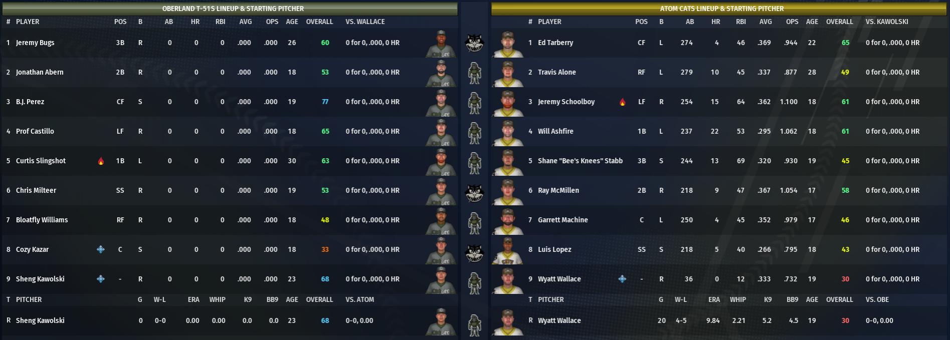 I also decided to add the boxscores instead of just the stories. No full linescores just yet. The nest post will be more organized. Today in the CBO News and Notes - Reports from around the Commonwealth by Nat Wright-Kowalski 20 August 2296 - Warwick Escapes in The Slog The Warwick Mirelurks took a 1-0 series lead, downing the The Slog Ghouls on the road at Tarberry Field Forever by a score of 8-7. Mirelurks center fielder Warwick Homestead went 5-5 with 2 doubles and 3 singles. He scored 2 runs and drove in 3. In the top of the first, with the game still scoreless, Homestead hit a run-scoring double to put his team in the lead. "Huge," Homestead said. "Getting a win in the first playoff game is huge." The next game is scheduled for tomorrow in The Slog. Slated to start are Justin Sphinx for the Warwick Mirelurks and Gary Estate for The Slog Ghouls. 20 August 2296 - Super Swinger -- Homestead Slams 5 Hits It doesn't happen very often, but it did for Warwick Homestead today -- a 5-hit effort. He went on a rampage at Tarberry Field Forever and paced the Mirelurks to a 8-7 win over The Slog Ghouls. After his dynamite batting performance, the Warwick center fielder told reporters that he "just tried to get in a good count and have a good at-bat. That's all I can control." His philosophy paid dividends today. He slammed 5 hits in 5 tries and put his name in the record book. Warwick Homestead hit an RBI double in the 1st, singled in the 3rd, doubled in the 5th, hit a two-run single in the 6th and singled in the 8th. In his stats this season, Homestead has posted a batting average of .353 with 95 hits in 269 at-bats, 5 home runs and 53 RBIs. He has also scored 51 runs, walked 16 times and compiled a .388 OBP. 20 August 2296 - Lady Killers Hammered by Basile, Fall Back 1-0 Finch Farm Four Leafs right fielder Matt Basile was the difference-maker at Valentine Detective Agency Field today, as he led his club to victory in a pivotal Game 1 of the Quarterfinals. The Four Leafs took the 11-4 win over the Starlight Lady Killers to seize a 1-0 lead in the best-of-5 series presented by Diamond City Radio. In the top of the first, with the game still scoreless, Basile hit a run-scoring single to put his team in the lead. The Four Leafs never trailed. "We're going to have to play flawless baseball from here on out," Starlight player-coach and losing pitcher City Moore said. "Which, let's face it, we haven't been doing lately." The next game is set to be played tomorrow. Slated to start are Steve Rocky for the Finch Farm Four Leafs and Enrique Rodriguez for the Starlight Lady Killers. 20 August 2296 - Cats Shut Out 51s in Game 1 Matchup Matt "Ace in the Hole" Hope knew he couldn't win the series for the Atom Cats because it would take a lot more than one start. The best he could do, he figured, was put the Cats up a game and give the Coolest Field in Town faithful a good time. Check and check. The Atom right-hander threw a complete-game shutout against the red-hot Oberland T-51s to get the Cats on the board in the series, striking out 2 along the way. The Cats will be looking to keep the momentum the next time the teams meet. With the 5-0 win, Atom now leads 1-0 in the best-of-5 series presented by WRVR. The T-51s had trouble solving Hope, who surrendered no runs on 5 hits over 9 innings. "I'll be honest," said Hope, "I didn't have much left in the tank." The next game is set to be played tomorrow at Coolest Field in Town. The scheduled starters for the game are Matt Udder for Oberland and Wyatt Wallace for Atom. 20 August 2296 - Oberland Blanked by Hope Everything clicked on the hill today for Matt "Ace in the Hole" Hope as he hurled the Atom Cats to a 5-0 shutout win over the Oberland T-51s, limiting them to 5 hits while recording 2 strikeouts and yielding 3 walks. He overpowered some batters with fastballs and buckled knees with sharp breaking pitches. "We had our shot at him a couple of different times," T-51s player-coach Jonathan Abern said. "We just weren't able to get to him." Hope has made 21 starts, tossed 126.1 innings, struck out 76 batters and walked 46. His record is 7-8 with a 7.05 ERA and he has limited other teams to a .317 batting average. 30 August 2296 - Big 9th Propels Abernathy Abernathy shortstop Austin Engill was the key at Fallon Field at Egret Tours Marina today, as he powered the Adamantium to victory in a critical Game 1 of the First Round. The Adamantium took the 12-9 win over the Egret Scrappers to seize a 1-0 lead in the best-of-5 series. Abernathy used a clutch hit from Kevin Covert to get the win. The pinch hitter drilled a grand slam home run in the top of the ninth inning to put the Adamantium ahead, 12-9. It was his only hit in 1 at-bat, but it was a game-changer. "Every team in baseball loses," Scrappers player-coach Troy Phillabum said. "We're in the playoffs and we still have the same guys that got us here. We'll bounce back." The next game is scheduled for tomorrow at Fallon Field at Egret Tours Marina. The scheduled starters for the game are Joe Penaltybox for the Abernathy Adamantium and Nick Poppa for the Egret Scrappers.