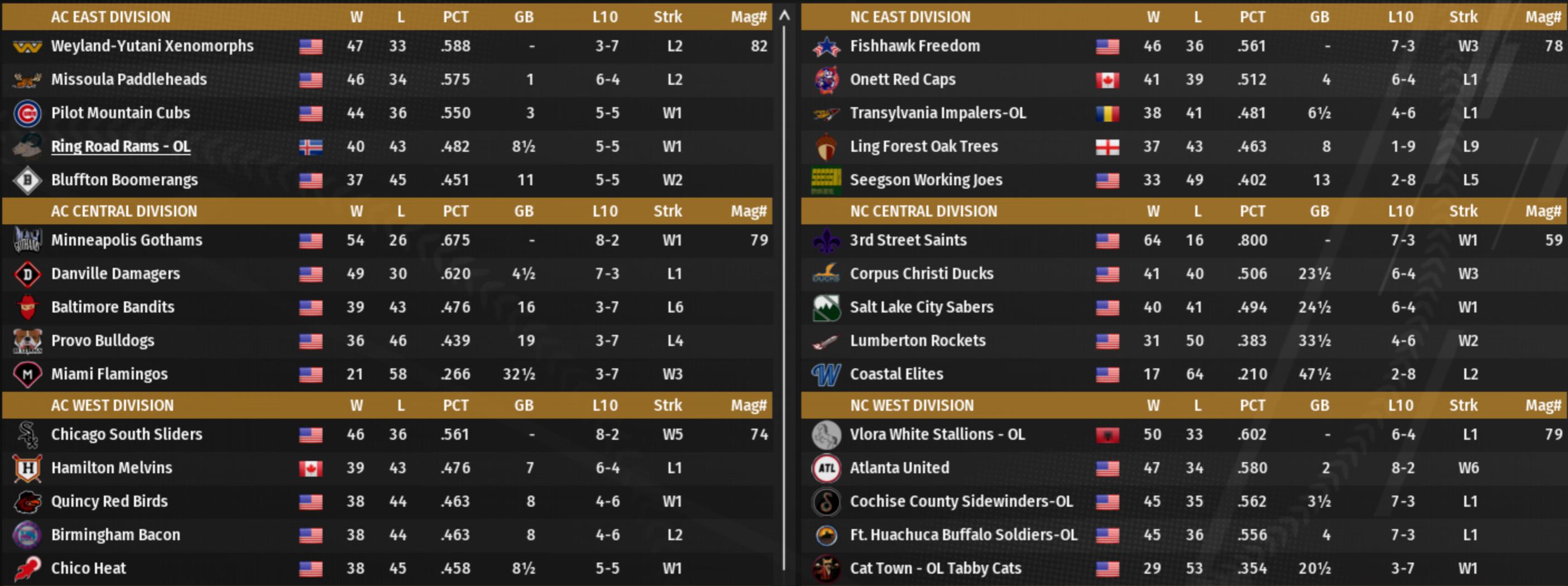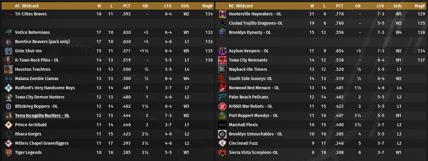 Laramie takes the OL crown with an impressive run in both OL play and overall. Playoffs: Laramie holds the top seed overall, and Hidden Valley claimed a wild card spot so they could match up in the LDS. On the NC side, only Waffletown made the post season, so an off-chance of an OL WS. relegations: -Brooklyn Dynasty -Norwood Red Menace -South Side Gooeys -Ciudad Trujillo Dragones -Terra Incognita Rustlers |