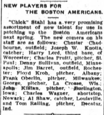 From left to right - 1) Player is identified as "Railing", but there is no player named Railing in BR. I think he bears a resemblance to Sox player Jack Hoey, pictured at the bottom right below. Thoughts? 2) Identified as Killian, but there is no player in Sox history with that name. There was a Tiger pitcher named Ed Killian at that time, and there is a resemblance, and the Tigers were wearing black pants at the time. BUT - Killian was 5' 11", which would put him 2 inches taller than #3, who is Ralph Glaze, who checked in at 5'9". I think (Hope?) #2 might be Tex Pruiett - he had a cleft chin and was an inch shorter than Glaze (image of Pruiett below between the larger image and Hoey) . 3) Ralph Glaze 4) Unidentified - any assistance would be appreciated. 5) 'Nuf Ced McGreevey 6) Cy Young 7) Rube Kroh Thanks for any assistance![/QUOTE] |