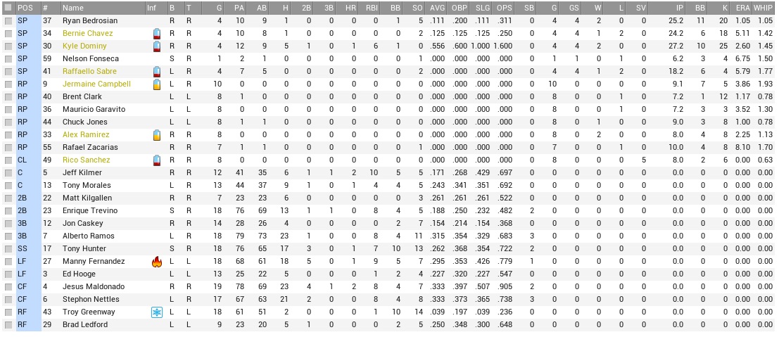 Here were too middling teams that didn’t know whether to go up or down. The Mines had a -22 run differential that probably hinted at down, with the main issue being their eighth-place offense that had the worst batting average in the Federal League, despite routinely stellar Danny Santillano (.320, 8 HR, 25 RBI), who led the team triple crown competition rather comfortably. We had swept them last season. Projected matchups: Kyle Dominy (4-0, 2.38 ERA) vs. Matt Peterson (4-1, 2.60 ERA) Ryan Bedrosian (3-0, 2.00 ERA) vs. Joe West (1-1, 2.87 ERA) Bernie Chavez (1-3, 4.30 ERA) vs. Roberto Pruneda (2-2, 3.08 ERA) More right-handed opposition inbound. …and while the Raccoons *wanted* to lead off the series with Kyle Dominy, he was a late scratch. At game time, he showed up looking like death, and coughing violently. Nelson Fonseca (1-1, 5.79 ERA), who was supposed to be skipped through Monday’s off day, had to scramble to get pants on to make the Tuesday start after all. Good beginning to the week! Game 1 PIT: CF del Toro – C Zarate – 1B Santillano – SS Rowell – 3B Lastrade – RF A. Wade – LF Reeves – 2B Freeman – P M. Peterson POR: 3B Ramos – 2B Trevino – LF Fernandez – 1B Maldonado – CF Nettles – RF Greenway – SS Hunter – C Morales – P Fonseca Predictably, Fonseca was torched. Omar Lastrade hit a leadoff jack in the second inning, after which Fonseca nailed or walked the bases full until he gave up a 2-out, 2-run single to Danny Zarate. Danny Santillano also hit a scorcher, but lined out to Trevino. While the Raccoons continued to have no fifth starter worth the breath required to mention him, the Raccoons did some copycatting in the bottom of the third inning. Tony Morales led off with a homer to right, 3-1, before Fonseca, Berto, and Cosmo all singled in order to load the bases with nobody out. Manny Fernandez tied the game with a single to right-center, with the trailing runners reaching scoring position after Adrian Wade’s ill-advised throw to home plate. Maldonado and Nettles both hit RBI singles, 5-3, and while Troy Greenway struck out to become the first Critter retired in the inning, the Tony Troup each added a run on Hunter’s groundout and Morales’ single. Fonseca reached on a Ben “Nine Fingers” Freeman error (that tenth finger would sometimes be handy!) but Berto grounded out to end the 7-run onslaught. Then Fonseca, the ******* loser, set out to blow the game anyway. Freeman double, walk drawn by T.J. Sera, Zarate and Rick Rowell with RBI singles … the tying runs were on the corners in the fourth inning when the Raccoons axed their failed starter, brought in Brent Clark, saw him get to 1-2 against Lastrade, then give up a double anyway. Zarate scored, and Rowell was sent around from first base, but was cut down in a collision at the plate that ended the inning with a 7-6 score. He was replaced by Devon Ponto. Clark put runners on the corners in the fifth inning before being yanked for Campbell, who narrowly escaped blowing the lead. He entered in a double switch with Brad Ledford (Greenway’s bum ended up on the bench), who singled home Tony Hunter in the bottom 5th, 8-6. In a wicked game, the Raccoons would load the bases against Josh Heckman in the bottom 6th. Two down, Tony Morales doubled home Nettles and Jon Caskey, reaching double digits, before Ledford grounded out, but the two runs were beaten back out of an old and crummy Mauricio Garacito in the seventh. Even worse was Rafael Zacarias, who appeared in the eighth, allowed a single to Lastrade, nailed Adrian Wade, and then gave up a 3-piece to Bill Reeves. At that point the Miners were ahead 11-10, and I was ready for murder. The Coons did nothing in the bottom 8th, and Morales grounded out against Robbie Peel to begin the bottom 9th. Jeff Kilmer then hit for Ledford as the final righty option on the bench, tripled into the gap, and the tying run was now 90 feet away. Berto jumped on the chance, singled to right, where Wade overran the ball for an extra base, and defeat was staved off for the time being. But even with Berto on second base, Cosmo struck out and Ed Hooge – last guy off the bench – hitting in the #3 hole earlier vacated in one of many, many fruitless double switches – grounded out. Thus, extras beckoned in an 11-11 game, in which the Raccoons had little else to give. And the game had yet more to give – like a scoreless 10th by Rico Sanchez. Nettles singled in the bottom of the inning, but was caught stealing. Sanchez then retired the first two in the 11th before allowing a single to del Toro, and beaning Zarate. That was a problem for the Miners – their bench was also empty, and they now didn’t have a catcher left! Roberto Pruneda pinch-ran for Zarate, and Santillano, trying to exact revenge on the Coons, struck out to end the inning. Pruneda, starting pitcher by trade, ended up behind the plate, catching right-hander Carlos Rojo, but the Raccoons – the Tony Troup and pinch-hitter Bernie Chavez – all made quick outs. With Chuck Jones handling the situation in the 12th without killing anybody else, the Raccoons resorted to the top of the order against the same battery, with Cosmo ripping a 1-out triple to center. The Miners didn’t buy into Ed Hooge and walked him. Maldonado grounded to third base, with Lastrade pinning Trevino before throwing out the batter at first base. I screamed in agony. There was no walk to Stephon Nettles with first base open and Matt Kilgallen batting behind him – and that was the end of the game, with Nettles singling to center. 12-11 Critters. Ramos 3-7, RBI; Fernandez 2-5, 2 RBI; Maldonado 3-7, RBI; Nettles 4-7, 2 RBI; Caskey (PH) 1-1; Morales 3-6, HR, 4 RBI; Ledford (PH) 1-1, RBI; Kilmer (PH) 1-1, 3B; Sanchez 2.0 IP, 1 H, 0 R, 0 BB, 1 K; After this drainer of a game, the Raccoons made some changes. Nelson Fonseca (1-1, 7.25 ERA) was optioned to the Alley Cats. So was Rafael Zacarias (0-1, 7.27 ERA). Well, he woul
