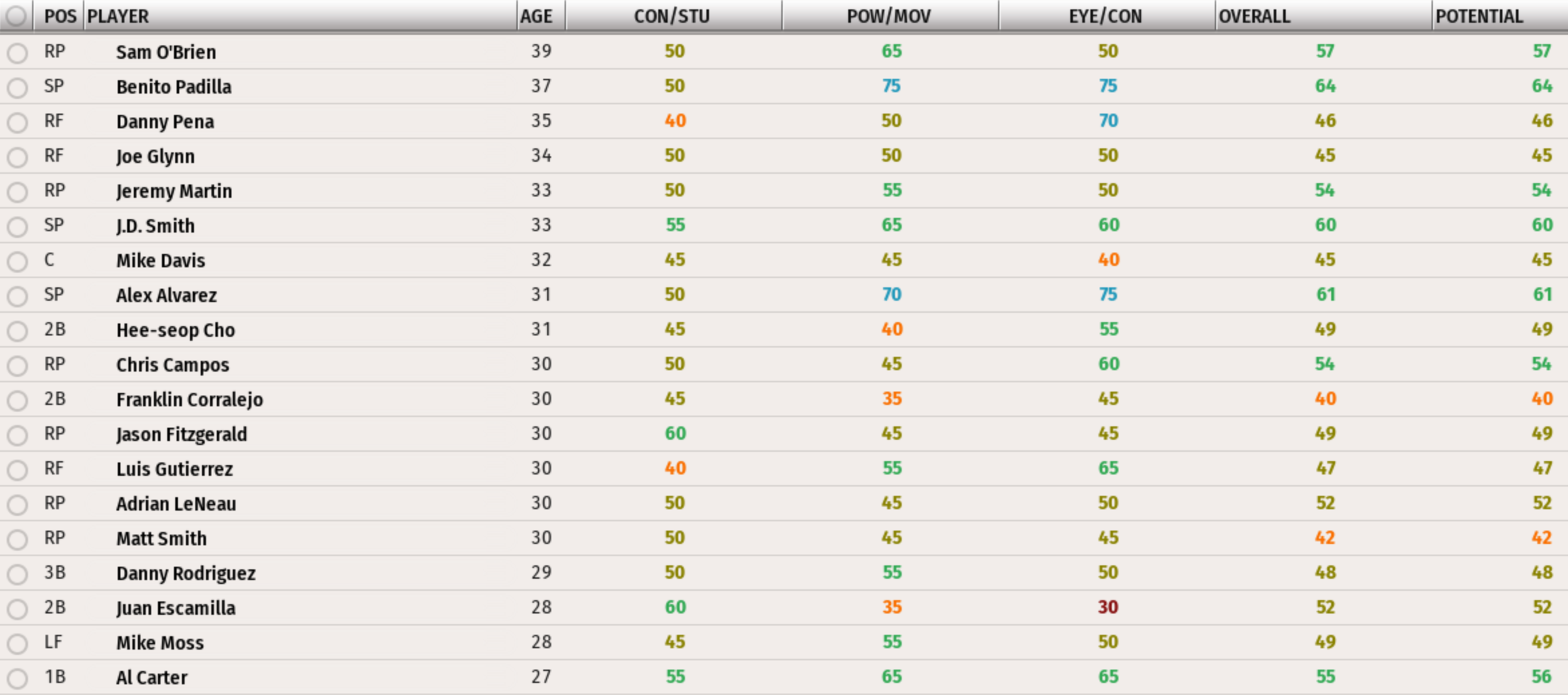 Before I do Otis Garber's own proposed player profile for his potential 1904 debut here with Houston, I'd also like to see the main pages for the following players, please, if I can, for the exact same reasons as above for D.J. Freeman, of course: Danny Pena Joe Glynn Mike Moss Adrian LeNeau Matt Smith Looks like the first three listed above might perhaps be prime candidates to potentially be replaced on the field when Otis is not pitching. Also, Houston apparently needs at least some left-handed pitching as well, if it doesn't already have any. While Otis won't likely be primarily a pitcher, I think he could still potentially help Houston on the mound if he has decent enough pitching ratings as well, somehow. I'll try to have both players' prospective profiles sent to you by the end of the weekend, at the latest, if that's all right with you, so you can hopefully better start off 1904 with them. So please keep a fairly close eye on your inbox here by then, okay? Thanks. CD out.